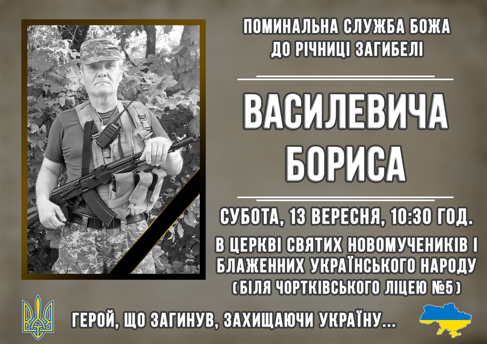 Запрошуємо на поминальну службу за загиблим Героєм України Василевичем Борисом, який віддав життя за свободу нашої держави. Церемонія відбудеться в суботу, 13 вересня, в церкві Святих Новомучеників і Блаженних українського народу, розташованій біля Чортківського ліцею №5. Це сумна, але важлива подія для громади, яка дозволяє вшанувати пам’ять нашого захисника. Василевич Борис Володимирович, народжений 18 липня 1970 року в селі Милівці Чортківського району, пройшов шлях від дитинства до зрілості на рідній землі. Його життя було наповнене різними етапами: з 1988 по 1990 роки він служив у лавах армії, здобуваючи досвід та дисципліну. Після служби він працював провідником вагонів на Львівській залізниці, а згодом провів 17 років за кордоном, можливо, в пошуках кращого життя чи нових можливостей. Однак, коли розпочалося повномасштабне вторгнення росії в Україну, Борис без вагань прийняв рішення повернутись на Батьківщину. Його патріотизм та відданість Україні проявилися особливо сильно, коли 5 березня 2022 року він став добровольцем на захист своєї країни. Він боронив нашу землю від ворога, не шкодуючи себе. На жаль, 16 вересня 2024 року серце Героя перестало битися. Його подвиг та жертовність назавжди залишаться в наших серцях. Похований Борис у Чорткові, на Алеї Героїв, що на кладовищі по вулиці Ягільницька. Це місце стало останнім спочинком для багатьох українських героїв, які загинули, захищаючи нас. У Героя залишилась дружина, дочка, син та сестра, які переживають глибоку втрату. Ми висловлюємо щирі співчуття родині та близьким. Нехай пам’ять про Бориса Василевича, його мужність і самовідданість, надихає нас бути гідними його жертви. Приєднуйтесь до спільної молитви, щоб вшанувати пам’ять нашого захисника та підтримати його родину у цей важкий час. Ваша присутність буде знаком поваги до його подвигу.