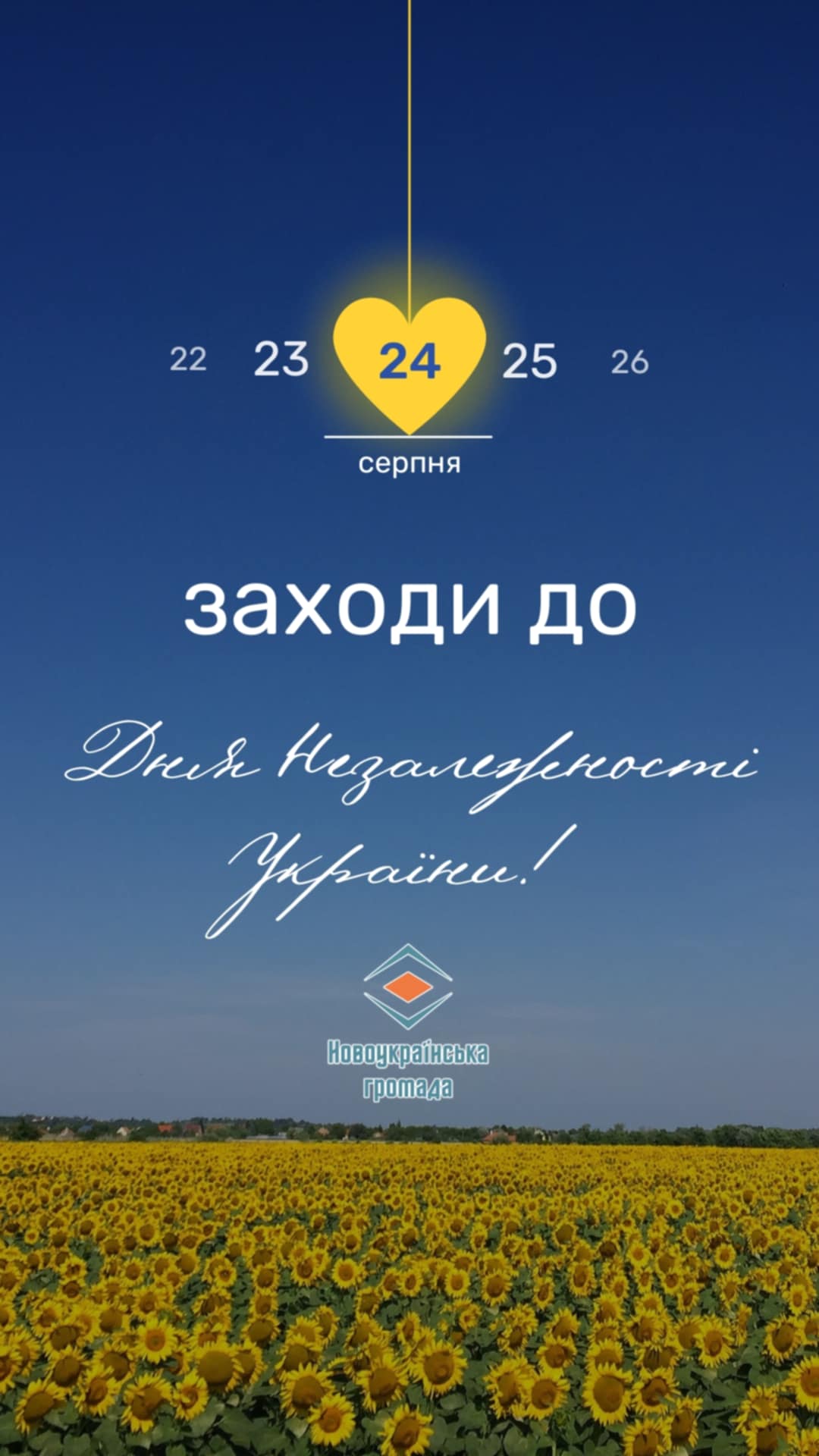 💙💛 Громада Новоукраїнська запрошує мешканців та гостей долучитися до низки урочистих та патріотичних заходів, присвячених Дню Незалежності України. Святкова програма обіцяє бути насиченою та цікавою для всіх вікових категорій.