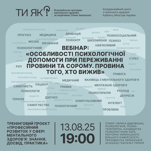 📌 Запрошуємо до участі у вебінарі «Особливості психологічної допомоги при переживанні провини та сорому. Провина того, хто вижив» організованого Всеукраїнською програмою ментального здоров’я Ти як? – ініціативи Олени Зеленської, який відбудеться онлайн 13 серпня 2025 року о 19:00