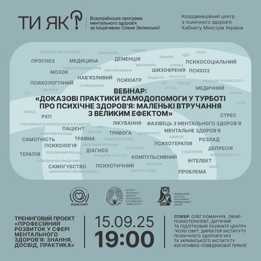 Запрошуємо до участі у захоплюючому вебінарі «Доказові практики самодопомоги у турботі про психічне здоров’я: маленькі втручання з великим ефектом». Ця онлайн-подія відбудеться 15 вересня 2025 року о 19:00 і буде присвячена найактуальнішим питанням ментального здоров’я. Вебінар є унікальною можливістю отримати знання та практичні навички від провідного фахівця.