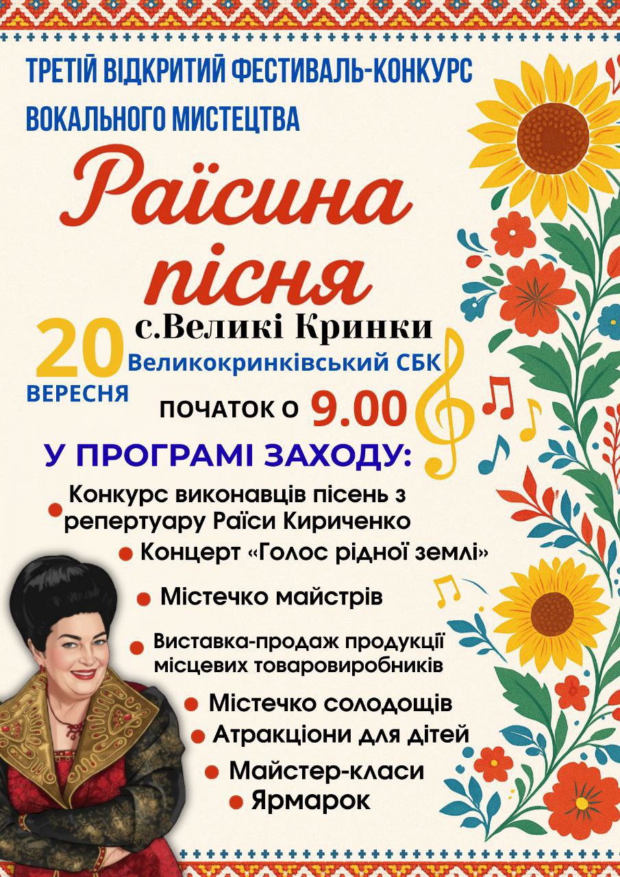 ✨ Запрошуємо всіх на незабутнє свято музики та народної творчості – фестиваль «Раїсина пісня»! Цього року захід обіцяє бути ще більш насиченим та яскравим, пропонуючи відвідувачам широкий спектр розваг та можливостей для відпочинку. Готуйтеся до справжнього вибуху емоцій та позитиву!
