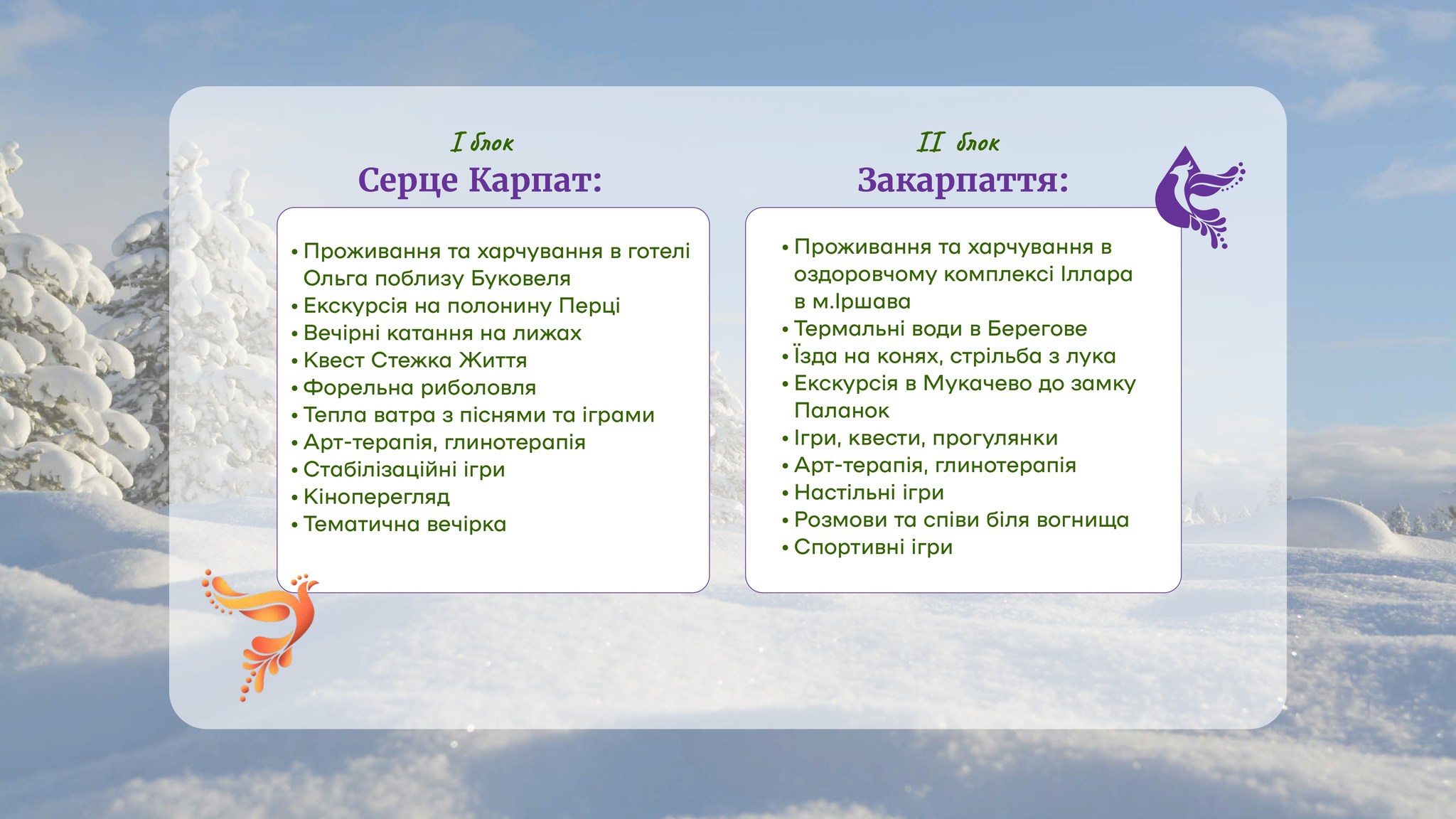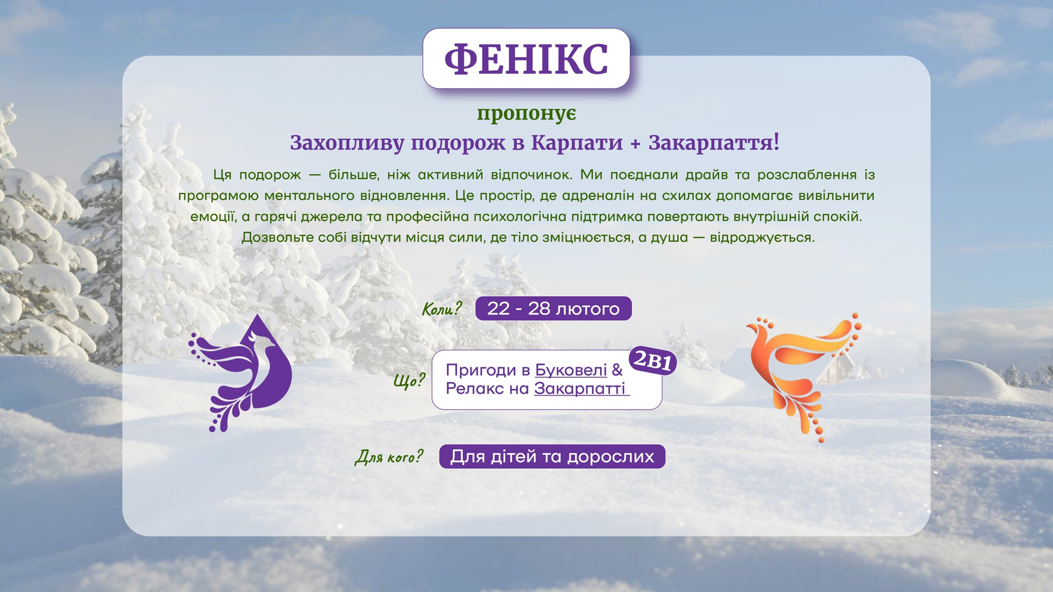 Табір «Фенікс» відбудеться з 22 по 24 лютого в мальовничих Карпатах. Ми подбали про всі аспекти комфортного перебування: трансфер в обидві сторони, затишне проживання та збалансоване харчування. Програма табору насичена та різноманітна: робота з професійними психологами, пізнавальні майстер-класи, захоплюючі розважальні заходи, катання на лижах у відомому гірськолижному курорті Буковель, інноваційна психофізична реабілітація, а також пізнавальна екскурсія на Полонину Перців.