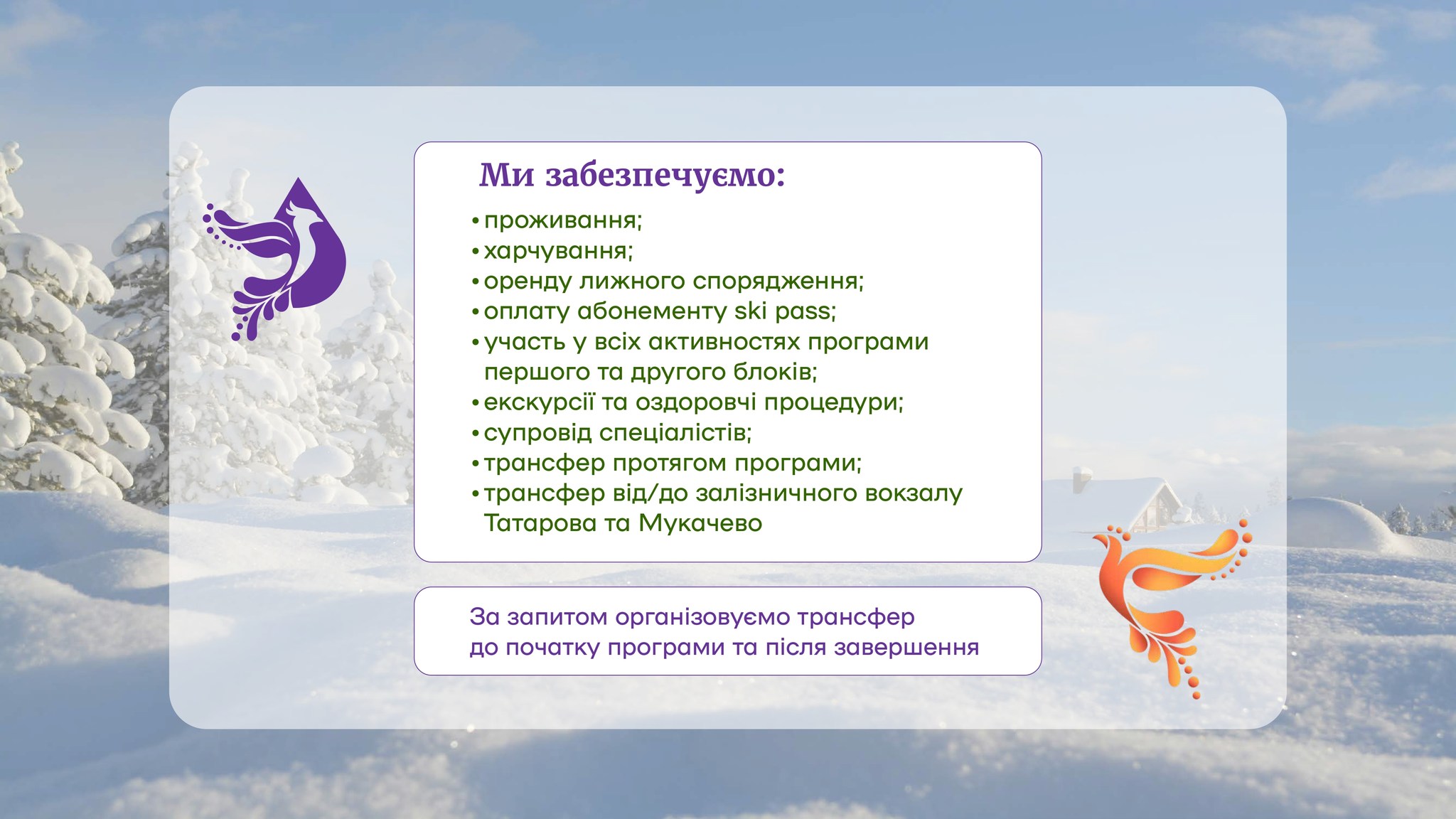 Запрошуємо дітей військовослужбовців Білозірської громади до участі у унікальному зимовому таборі в Карпатах. Цей проєкт, що реалізується в межах програми відновлення ментального здоров’я «Фенікс», покликаний забезпечити дітям незабутній відпочинок та комплексну підтримку.