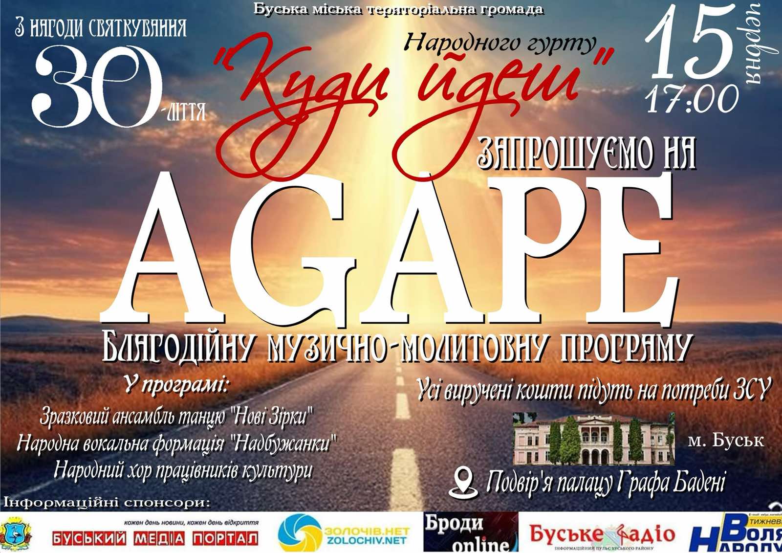 Приєднуйтеся до нас на благодійній музично-молитовній програмі «AGAPE»! Відзначимо 30-річчя гурту «Куди йдеш» разом та підтримаємо наших героїв! Цей захід стане символом єдності, духовності та незламної віри в перемогу України. Чекаємо на вас 15 червня о 17:00 на подвір’ї палацу графа Бадені!