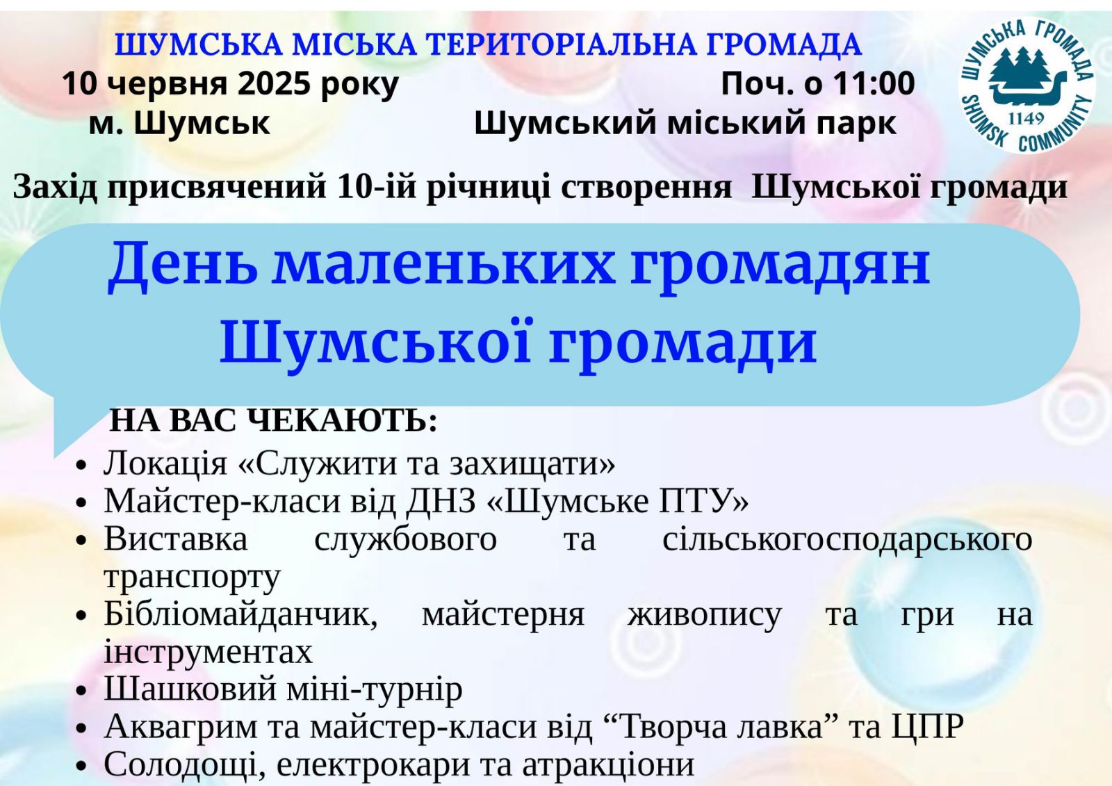 Раді запросити жителів та гостей нашої громади на святкування «Дня маленьких громадян Шумської громади», присвячене 10-ій річниці її створення! Відзначення відбудеться з розмахом та безліччю цікавих заходів для дітей та дорослих. Це чудова нагода провести час разом, відсвяткувати ювілей громади та подарувати радість наймолодшим її мешканцям.