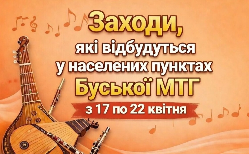 🇺🇦 Запрошуємо мешканців долучитися до культурно-мистецьких, духовних, екологічних та пізнавальних заходів у населених пунктах Буської міської територіальної громади в період з 17 по 22 квітня 2026 року.
