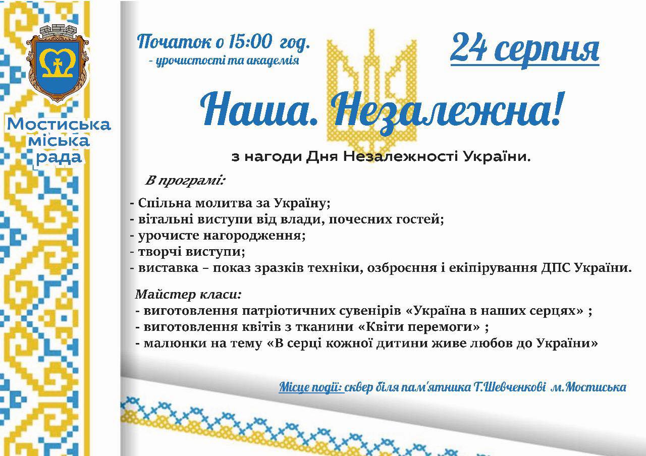 Святкування розпочнеться з урочистого підняття Державного Прапора, яке символізуватиме нашу незламність та прагнення до перемоги. Ми відзначимо цей день як свідчення нашої історії, сповненої випробувань, але й великої гордості за нашу державу. Прийдіть, щоб разом продемонструвати нашу єдність, підтримку та любов до України. Разом ми вшануємо пам’ять тих, хто боровся за нашу свободу, і відзначимо досягнення нашого народу.