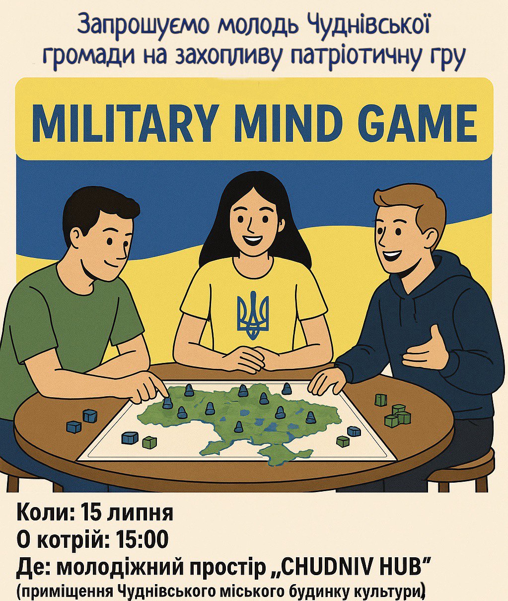 📍 Де: молодіжний простір “CHUDNIV HUB” (приміщення Чуднівського міського будинку культури, вул. Героїв Майдану, 95-Б, І поверх) Наголошуємо, що весела атмосфера та драйв від гри – гарантовані! Це буде незабутній досвід для кожного учасника. Запрошуємо тебе та твоїх товаришів стати частиною цієї захопливої події, що об’єднує інтелект, стратегію та патріотизм. Не втратьте шанс поринути у світ захоплюючих завдань і приємного спілкування. Ця патріотична гра чекає на вас! Для участі обов’язкова реєстрація за посиланням: https://forms.gle/8V6XjpjRodpcQXhe7. Зареєструйтеся заздалегідь, щоб забезпечити собі місце та можливість долучитися до цієї унікальної події у Чуднові. Розробка та реалізація інтелектуальної гри “Military mind game” здійснюється Управлінням молоді та спорту Київської обласної державної адміністрації спільно з Київським обласним молодіжним центром, у партнерстві з Відділом культури, молоді та спорту Чуднівської міської ради. Це свідчить про високий рівень організації та значущість заходу для розвитку молодіжного потенціалу регіону. Не пропустіть нагоду взяти участь у цій знаковій події для Чуднівської громади!