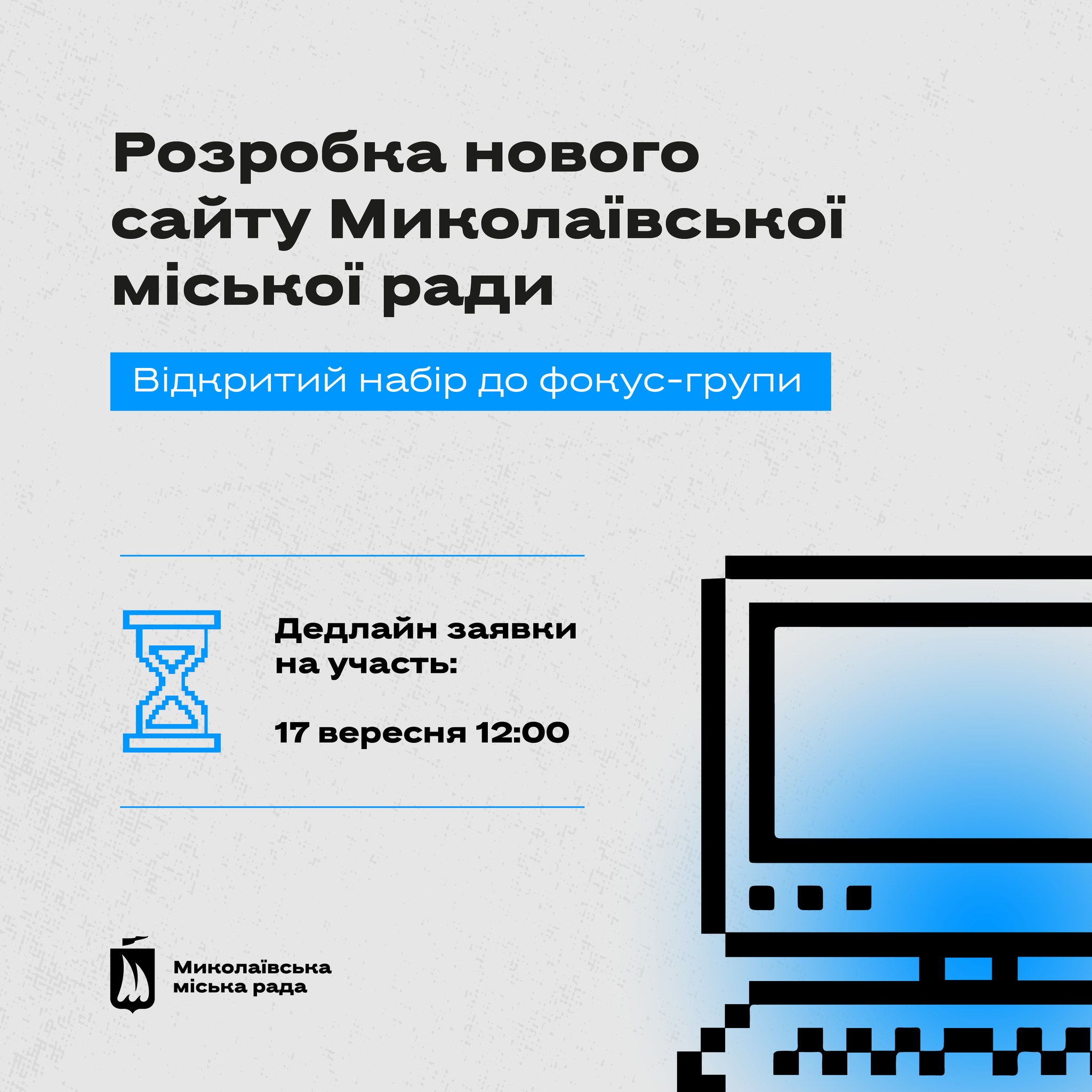 👉 Оголошуємо набір до фокус-групи для тестування дизайн-версії нового сайту Миколаївської міської ради. Термін прийому заявок – 17 вересня, 12:00.