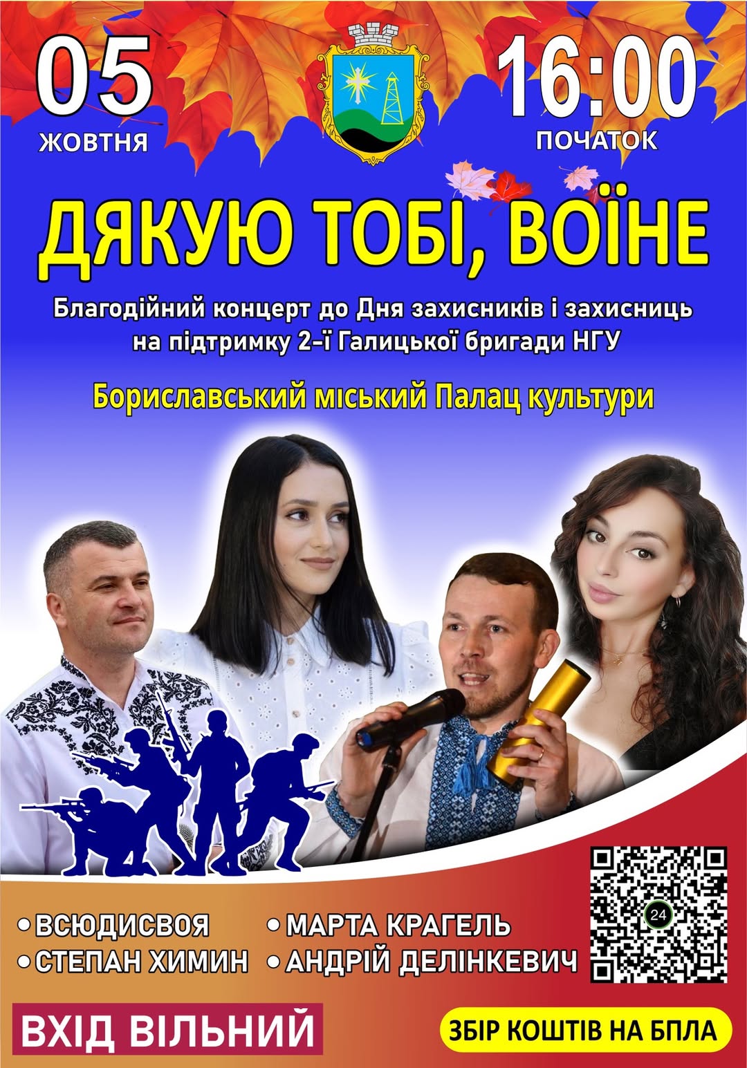 📍 Нагадуємо, що у неділю, 5 жовтня, в Бориславському міському Палаці культури відбудеться незабутній благодійний концерт “Дякую тобі, воїне” до Дня Захисників та Захисниць України. Це чудова нагода вшанувати наших героїв та долучитися до важливої справи. Початок заходу о 16:00. Цьогорічний концерт проводиться на підтримку 2-ї Галицької бригади Національної гвардії України, допомагаючи тим, хто захищає нашу свободу.