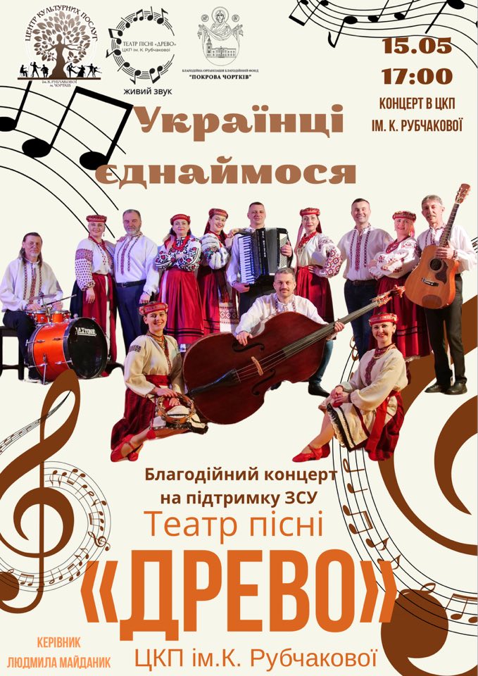 У Четвер, 15 травня, о 17:00 у Центрі культурних послуг імені Катерини Рубчакової відбудеться неймовірний благодійний концерт «Українці, єднаймося!». Гості заходу матимуть змогу насолодитися виступами театру пісні «Древо», що подарує атмосферу української музики та культури.