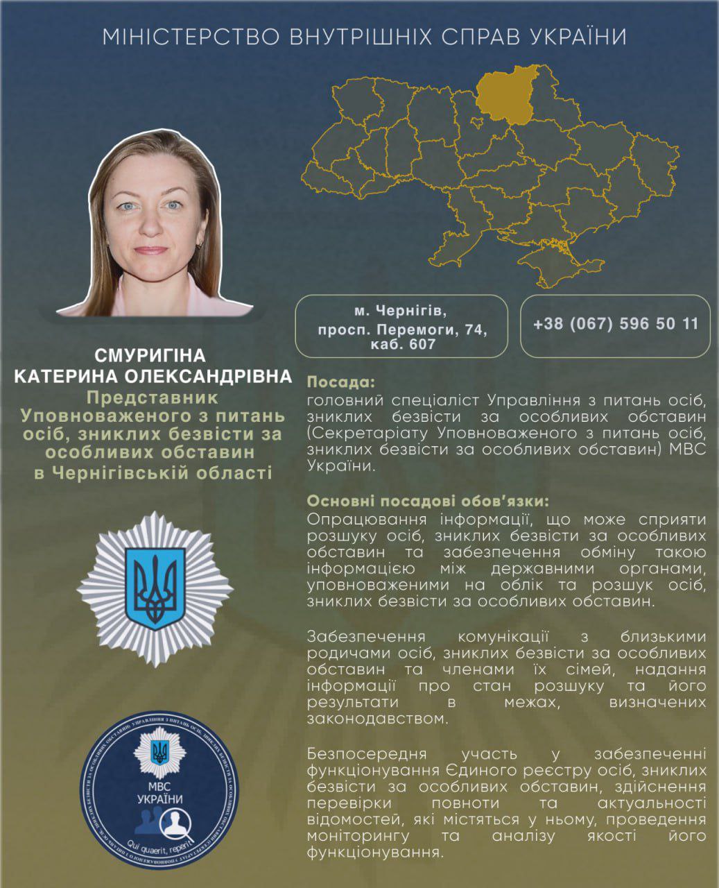 представницею Уповноваженого з питань осіб, зниклих безвісти за особливих обставин в Чернігівській області.
