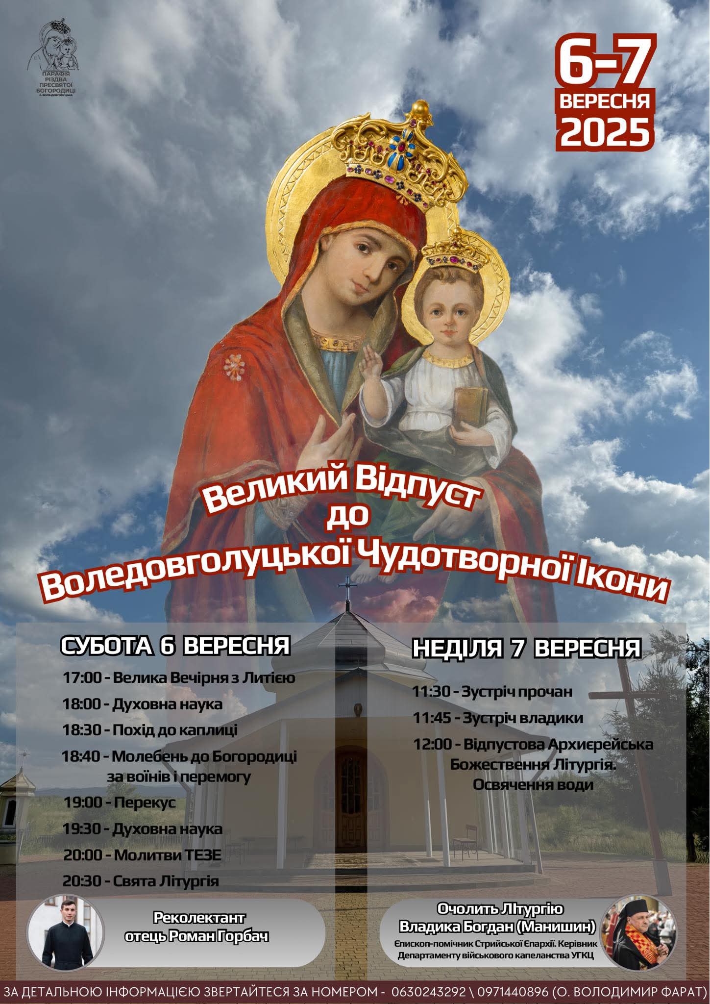 Запрошуємо долучитися до Великого Відпусту біля Воледовголуцької Чудотворної Ікони Пресвятої Богородиці. Парафія Різдва Пресвятої Богородиці села Воля Довголуцька Української Греко-Католицької Церкви щиро запрошує всіх бажаючих завтра, 07 вересня 2025 року Божого, до спільної молитви за наших мужніх воїнів та за довгоочікувану справедливу Перемогу нашої держави. Ваша присутність та молитва є надзвичайно важливими у цей непростий для всіх нас час.