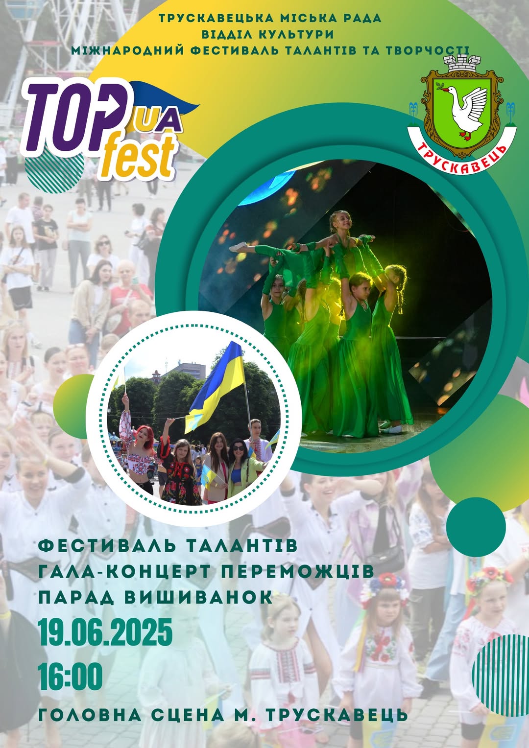 Запрошуємо всіх мешканців та гостей Трускавця на грандіозний галаконцерт Міжнародного фестивалю талантів та творчості «TOP FEST UA»! Ця феєрична подія стане справжнім святом мистецтва та подарує незабутні враження.