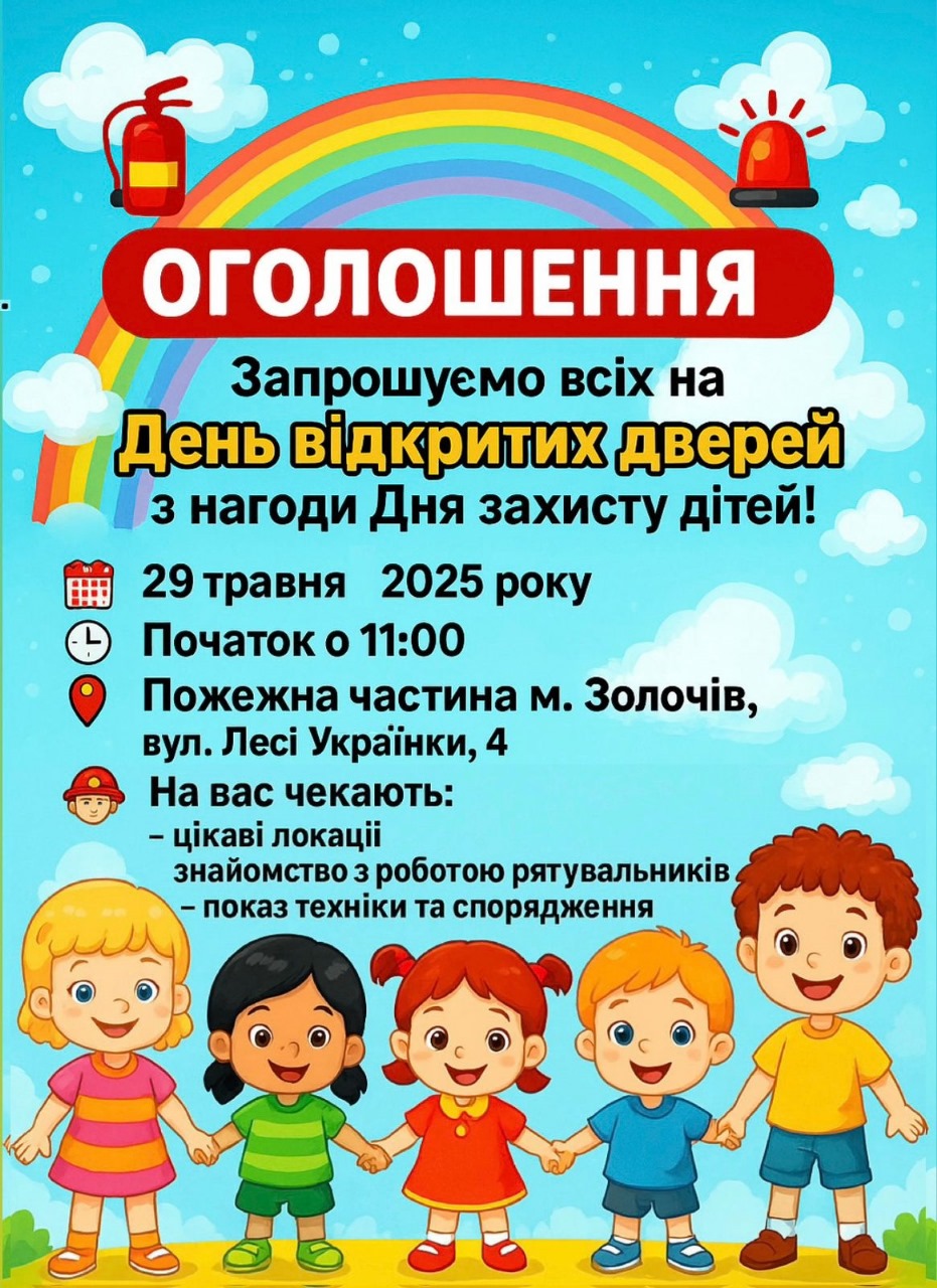 Запрошуємо всіх мешканців та гостей Золочева на День відкритих дверей до пожежної частини! Цей захід, присвячений Дню захисту дітей, відбудеться 29 травня 2025 року об 11:00 у Золочівському районному управлінні ГУ ДСНС України у Львівській області, а саме у пожежно-рятувальному підрозділі м. Золочів.