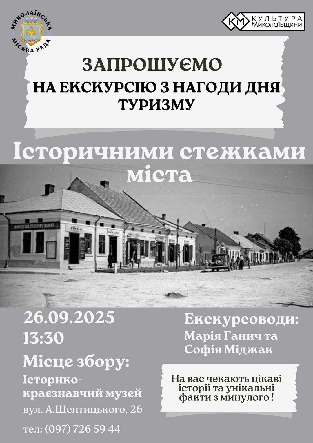 Запрошуємо всіх охочих на захопливу екскурсію “Історичними стежками міста”, яка відбудеться з нагоди відзначення Дня туризму. Ця подія — чудова нагода глибше пізнати наше місто, його багату історію та унікальні культурні надбання. Під час прогулянки ви почуєте цікаві історії та дізнаєтесь про невідомі факти з минулого, які відкриють знайомі вулиці та будівлі з нового, неочікуваного боку. Наші досвідчені екскурсоводи — Марія Ганич та Софія Міджак — поділяться своїми знаннями та любов’ю до історії, роблячи кожен момент незабутнім. Екскурсія “Історичними стежками міста” — це не просто прогулянка, а справжня подорож у часі, що дозволить відчути дух минулих епох та зрозуміти значення історичної спадщини для сучасності. Ми прагнемо підвищити обізнаність про туристичний потенціал нашого краю та заохотити мешканців і гостей міста до активного пізнання його історії. Не пропустіть чудову нагоду провести час з користю, дізнатися багато нового та отримати незабутні враження. Долучайтеся до нашої історичної подорожі, яка допоможе вам відкрити приховані скарби рідного міста. Ця екскурсія є частиною ініціативи з розвитку місцевого туризму та збереження культурної спадщини. Ми віримо, що такі події сприяють формуванню міцнішого зв’язку з історією та кращому розумінню нашого спільного минулого. Чекаємо на вас, щоб разом відкривати “Історичні стежки міста”! 🗓️ Коли: 26 вересня 2025 року о 13:30 📍 Місце збору: Історико-краєзнавчий музей, вул. А. Шептицького, 26. 📞 Додаткова інформація: (097) 726 59 44. Не пропустіть можливість поринути в історію та відкрити для себе знайомі вулиці по-новому!
