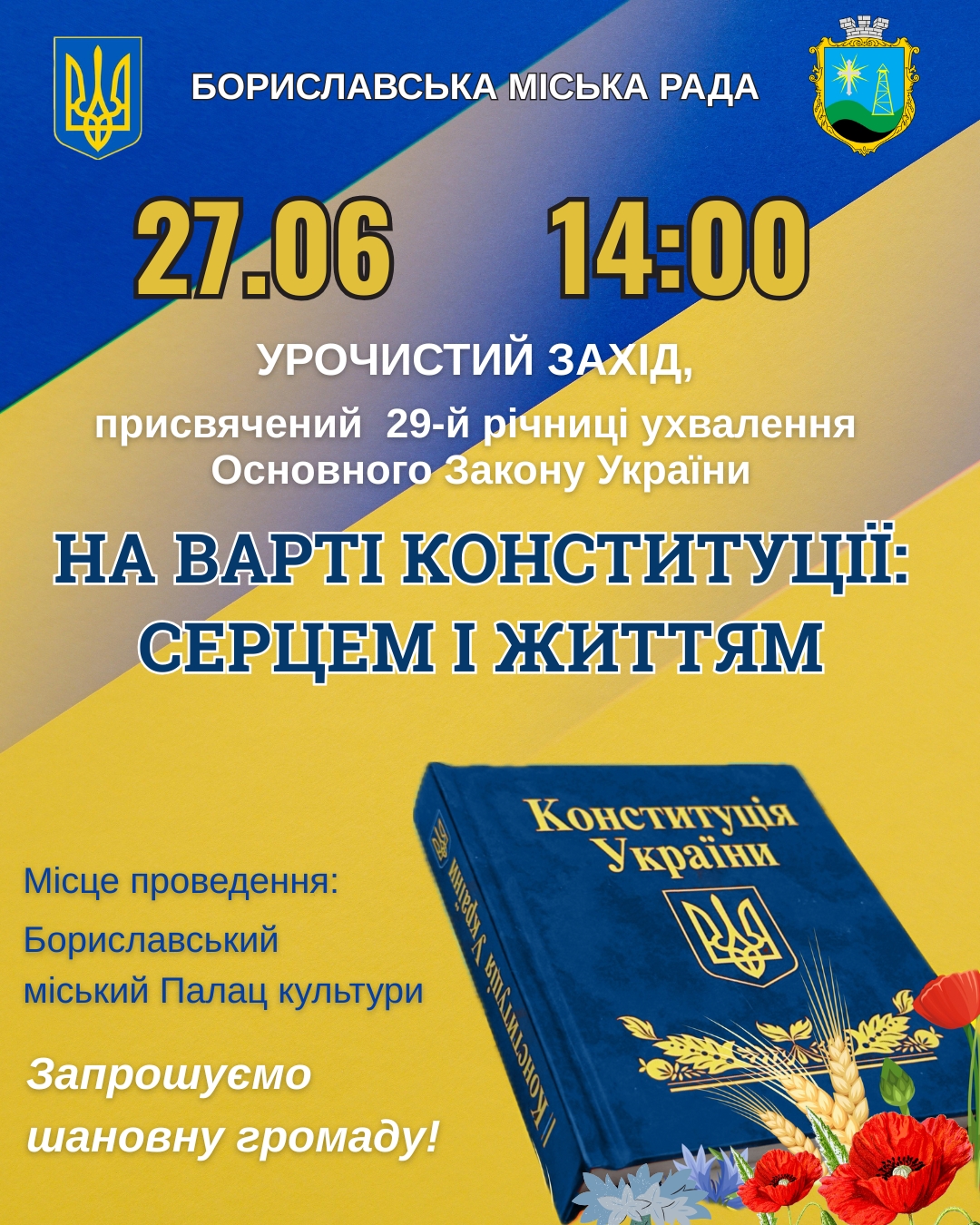 28 червня Україна відзначає День Конституції. З цієї нагоди напередодні, 27 червня, о 14:00 в приміщенні Бориславського міського Палацу культури відбудеться урочистий захід “На варті Конституції: серцем і життям”.
