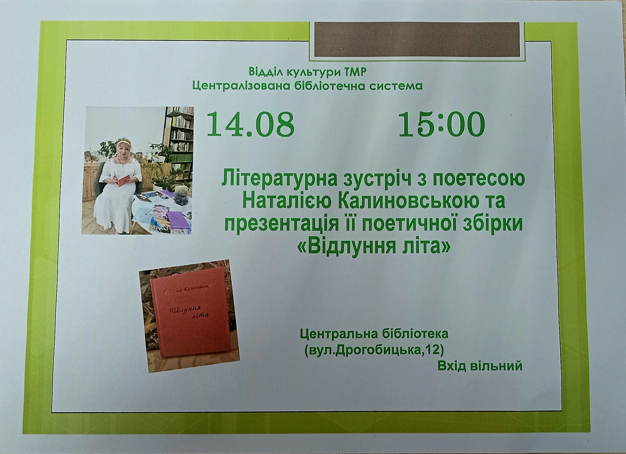 У четвер, 14 серпня, в Трускавецькій центральній міській бібліотеці відбудеться літературна зустріч з поетесою Наталією Калиновською та презентація її поетичної збірки “Відлуння літа”, написаної під час перебування в Трускавці.