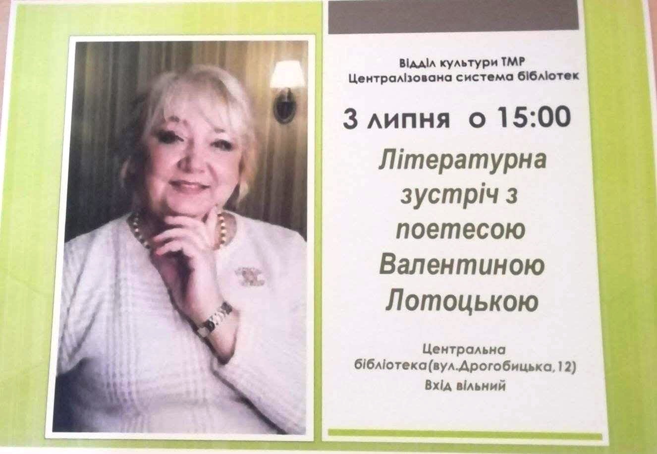 У четвер, 3 липня, в приміщенні центральної бібліотеки міста Трускавця (вул. Дрогобицька,12) відбудеться літературна зустріч з поетесою Валентиною Лотоцькою. Авторка презентуватиме свої поетичні збірки, а також нову збірку поезій “Вогонь війни”, видану у час повномасштабної війни.
