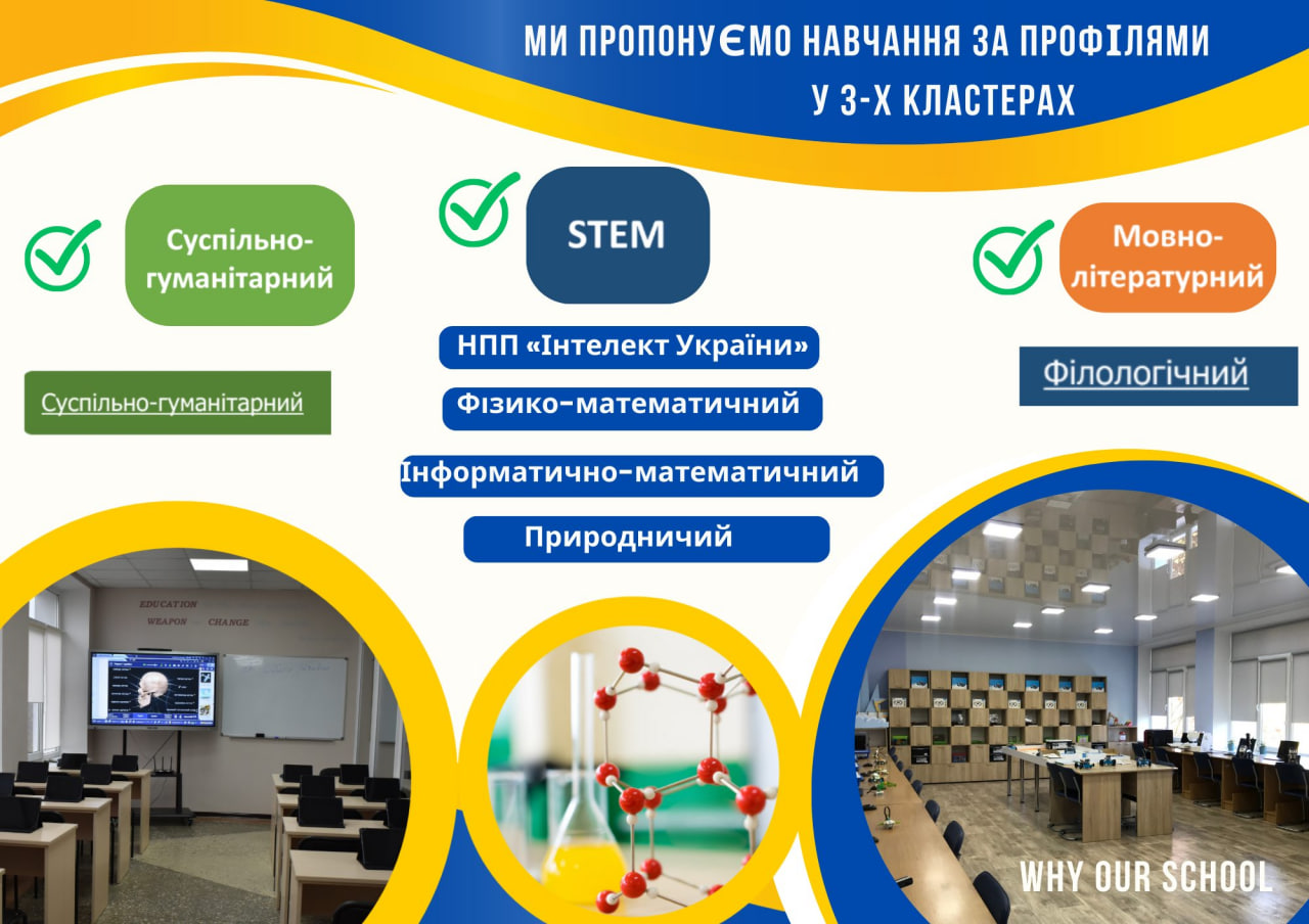 🔖 **STEM кластер:** Цей напрямок ідеально підійде для тих, хто захоплюється наукою, технологіями, інженерією та математикою. Обирайте між фізико-математичним, інформатико-математичним, математичним, хіміко-біологічним, економіко-географічним або мистецько-технологічним профілями.