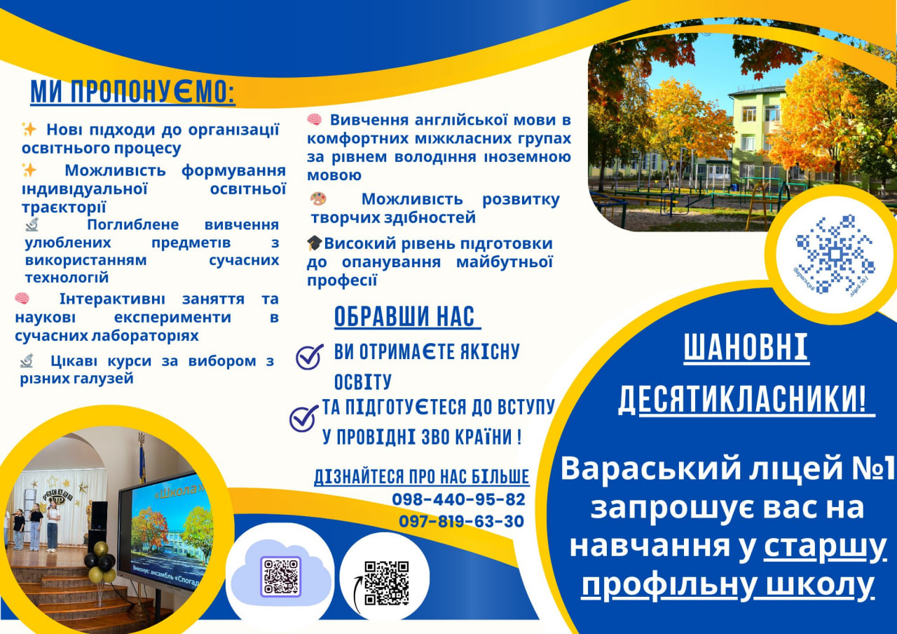 Вараський ліцей №1 з радістю оголошує набір майбутніх десятикласників до своєї старшої профільної школи. Ми пропонуємо унікальну можливість отримати якісну освіту та визначити свій майбутній шлях серед 10 різноманітних напрямів, об’єднаних у 3 ключові кластери: