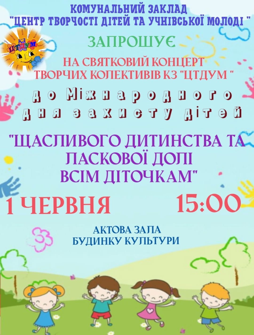 Напередодні Міжнародного дня захисту дітей, ми зберемося разом на святковому концерті колективів КЗ “ЦТДУМ” під керівництвом директора Алли Євгенівни Берш. Цей концерт стане чудовою нагодою сказати кожній дитині: ти заслуговуєш на щасливе дитинство та ласкаву долю!