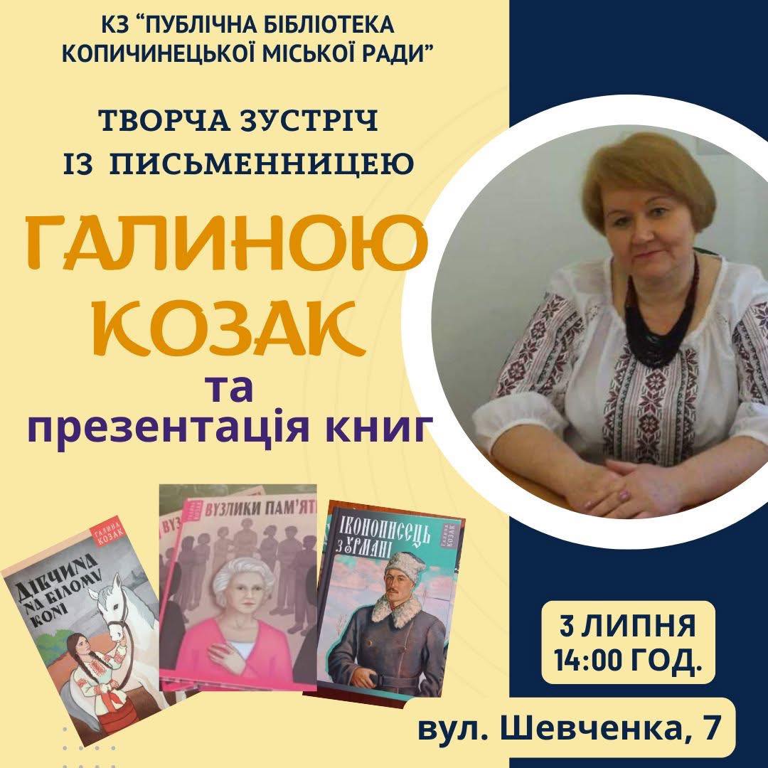 Запрошуємо на унікальну літературну подію: творчу зустріч з видатною українською письменницею Галиною Козак! Ми раді повідомити, що наша бібліотека знову стане майданчиком для незабутнього спілкування з авторкою, чиї твори вже підкорили серця багатьох читачів. Цього разу Галина Козак представить свої абсолютно нові видання, які обіцяють глибоко занурити в історичні та особистісні наративи, що так майстерно розкриває письменниця. Це чудова нагода не лише познайомитися з новинками, а й поспілкуватися особисто з творцем, поставити запитання та отримати автограф на згадку про цю знакову подію у Копичинцях.Зустріч з Галиною Козак є важливою подією для культурного життя нашої громади. Авторка, відома своїм глибоким розумінням людської душі та вмінням передавати складні історичні періоди через призму особистих доль, пропонує читачам не просто книги, а справжні подорожі у часі та просторі. Кожна її презентація книги – це не лише ознайомлення з літературними новинками, а й можливість для осмислення важливих суспільних та історичних тем, що резонують із сучасністю.Цього разу на літературній зустрічі будуть представлені три нові книги Галини Козак, кожна з яких є унікальною за своїм змістом та тематикою: