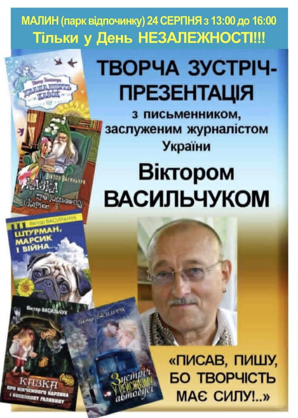 💙💛 Давайте разом проведемо цей святковий день в атмосфері культури, натхнення та єднання. Це унікальна можливість поспілкуватися з видатним діячем, який робить вагомий внесок у розвиток української культури, та відчути дух незалежності через призму його творчості та журналістської діяльності. Зустріч обіцяє бути насиченою цікавими думками, творчими роздумами та натхненними історіями, які допоможуть глибше зрозуміти роль літератури та слова у формуванні національної ідентичності та майбутнього України. Не пропустіть цю чудову нагоду долучитися до культурної події, яка збагатить ваш внутрішній світ та надихне на нові звершення. Віктор Васильчук, відомий своїми глибокими творами та проникливою журналістикою, поділиться своїм баченням розвитку української літератури та її місця у світі, а також обговорить актуальні суспільно-політичні теми, що хвилюють кожного українця. Приходьте, щоб отримати заряд позитивної енергії та натхнення в цей важливий для кожного громадянина день.