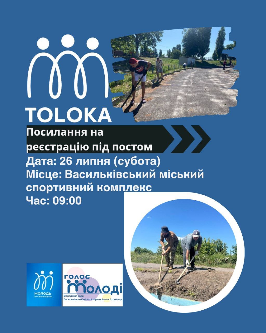 Громадська організація “МОЛОДЬ ВАСИЛЬКІВЩИНИ” та Молодіжна рада Васильківської міської ради “Голос Молоді” щиро запрошують усіх небайдужих мешканців долучитися до важливої події – толоки, що відбудеться 26 липня (п’ятниця) о 09:00 у Васильківському міському спортивному комплексі. Це чудова нагода об’єднати зусилля для покращення нашого спільного простору.