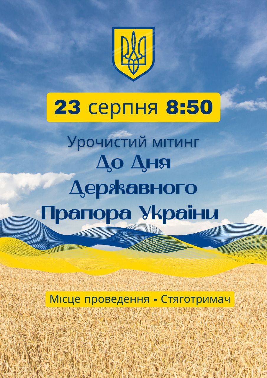 🇺🇦 Запрошуємо на урочистий мітинг до Дня Державного Прапора України! 🇺🇦 23 серпня ми разом піднімемо над рідною землею синьо-жовтий стяг – символ нашої сили, єдності та нескореності.