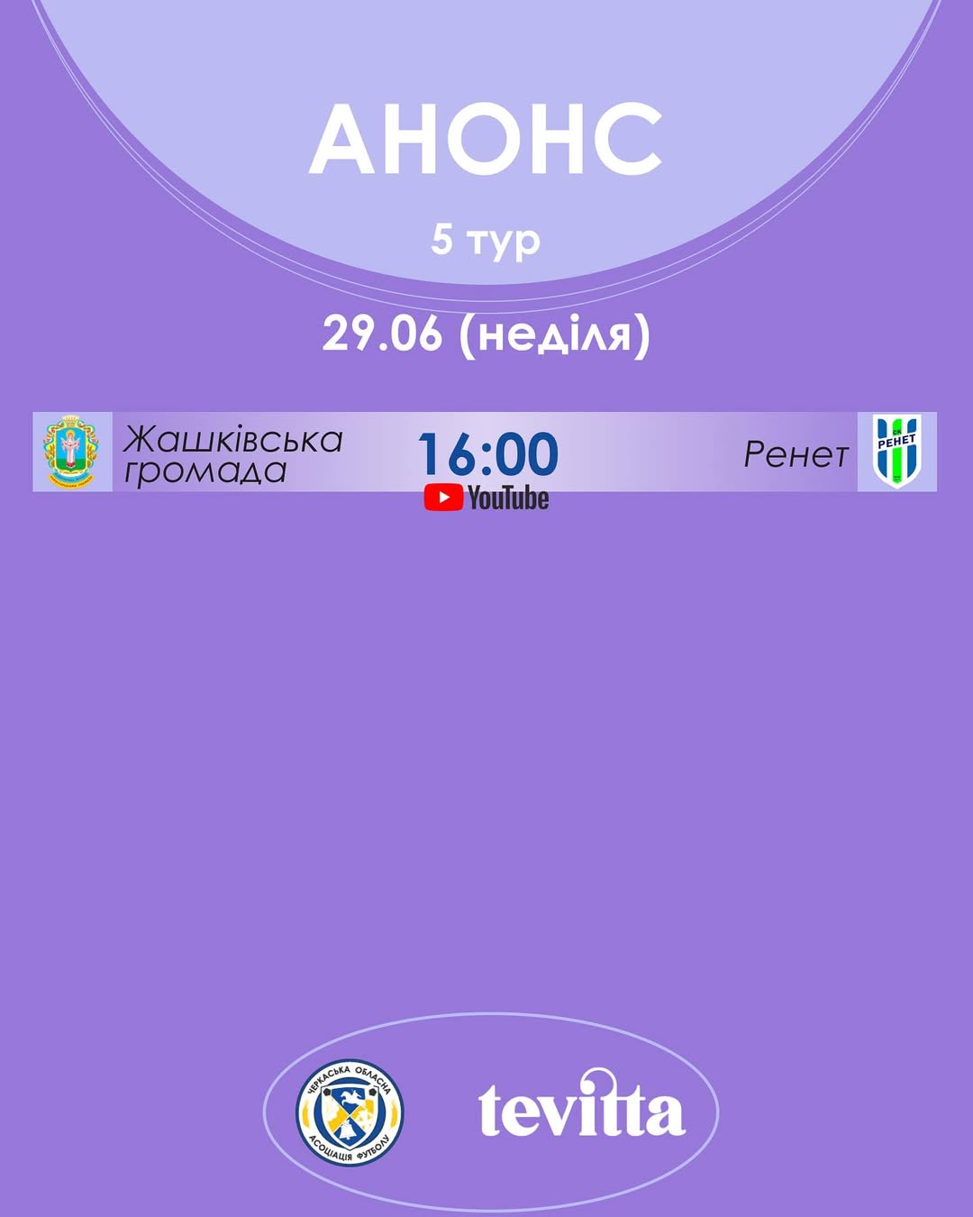 Сьогодні, 29 червня, о 16:00, Центральний стадіон Жашкова стане епіцентром запеклої боротьби. На поле вийдуть дві сильні та амбітні футбольні команди: місцевий СК “Жашківська громада” та їхні гідні суперники – СК «Ренет» з Мліївської ТГ. Цей перенесений матч 5-го туру має особливе значення, адже кожен бал у “Tevitta-лізі” є надзвичайно важливим для турнірного становища та подальших амбіцій команд. Це буде не просто черговий футбольний матч, а справжнє випробування для обох колективів.