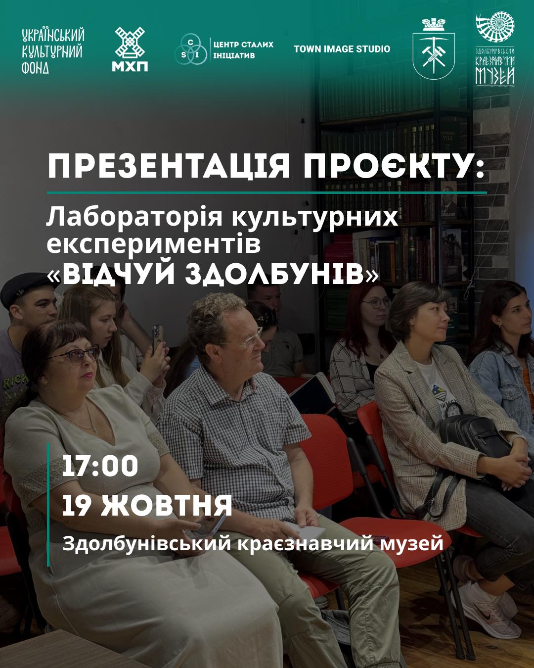 Проєкт “Лабораторія культурних експериментів «Відчуй Здолбунів»” реалізується за активної участі ГО «Центр сталих ініціатив» у тісній співпраці із Здолбунівським краєзнавчим музеєм, Town Image Studio та Здолбунівською міською радою. Ця ініціатива здійснюється за підтримки Українського культурного фонду та Благодійного Фонду “МХП-Громаді” в межах конкурсної програми «Культура у фокусі громад». Ми вдячні за цю можливість розвивати культуру на місцевому рівні.