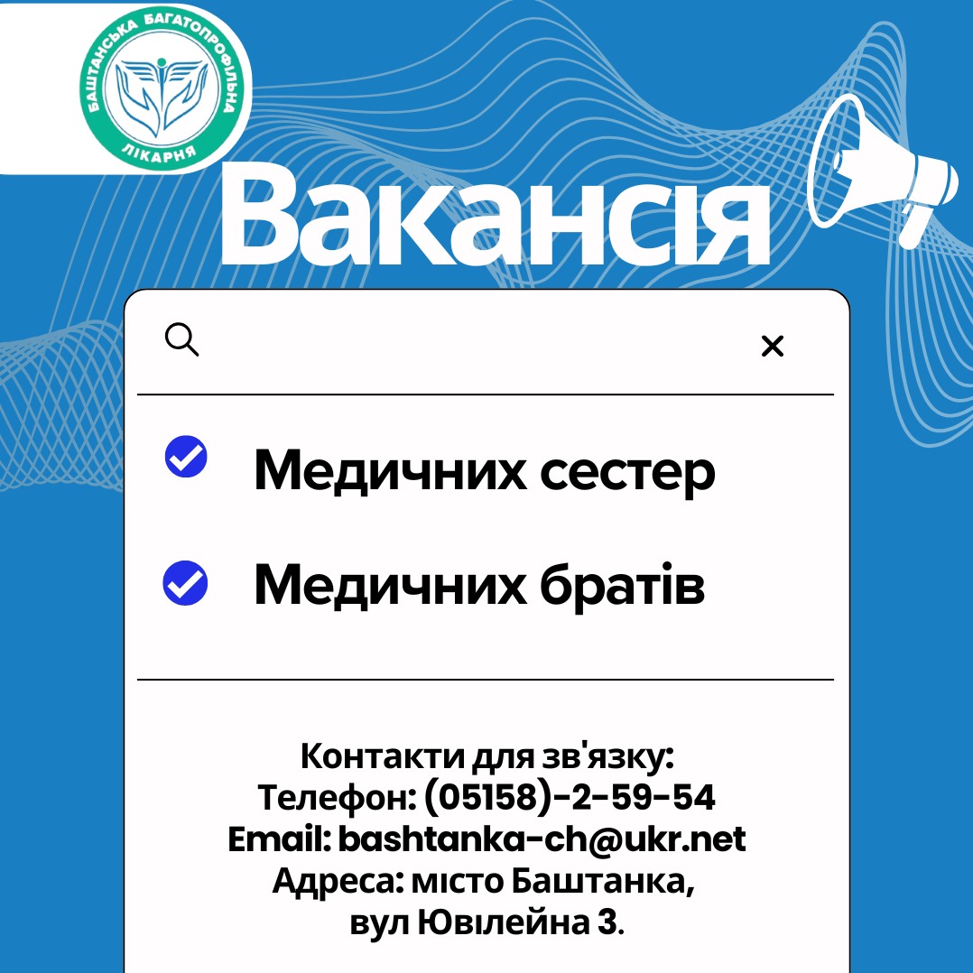 Ми будемо раді вітати вас у нашій команді! У Баштанській лікарні відкрита вакансія медична сестра! Чекаємо на ваші резюме та дзвінки.