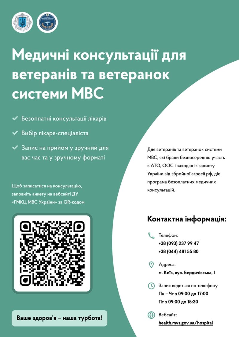 📍Програма передбачає гнучкість у виборі формату консультації: ветерани та ветеранки системи МВС можуть обрати як офлайн-прийом у ДУ «ГМКЦ МВС України» за адресою вул. Бердичівська, 1, м. Київ, так і онлайн-консультацію, що дозволить отримати допомогу, не виходячи з дому.
