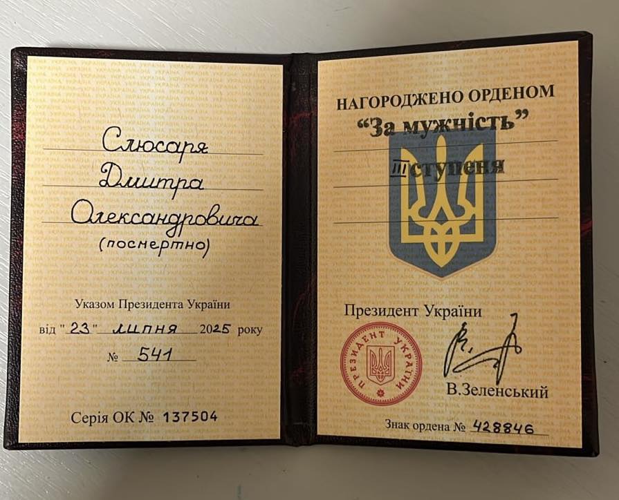 Сьогодні Ковель вшановує пам’ять свого Героя, Дмитра Олександровича Слюсаря, який віддав своє життя за незалежність та територіальну цілісність України. Урочисту церемонію вручення ордена «За мужність» ІІІ ступеня (посмертно) провела родина загиблого захисника. Цю високу державну нагороду, символ вдячності та шани, вручив заступник міського голови з гуманітарних питань Олег Зламанюк разом із тимчасово виконуючим обов’язки начальника 1-го відділу Ковельського РТЦК та СП Миколою Козаком. Вони висловили глибоку повагу до незламності, відваги та самопожертви Дмитра Слюсаря. Його ім’я назавжди вписане в історію нашого міста як приклад героїзму та патріотизму. Вічна слава та шана Герою України!