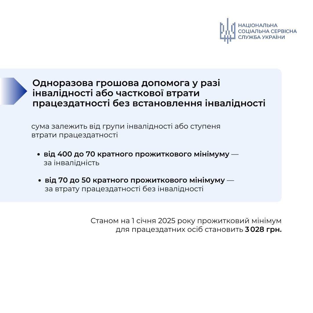 Одноразова грошова допомога: Розмір цієї допомоги визначається на основі ступеня втрати працездатності, який фіксується у відсотках або групою інвалідності. Важливим фактором є також причинний зв’язок між отриманою травмою або пораненням та виконанням військової служби, зокрема захистом Батьківщини.
