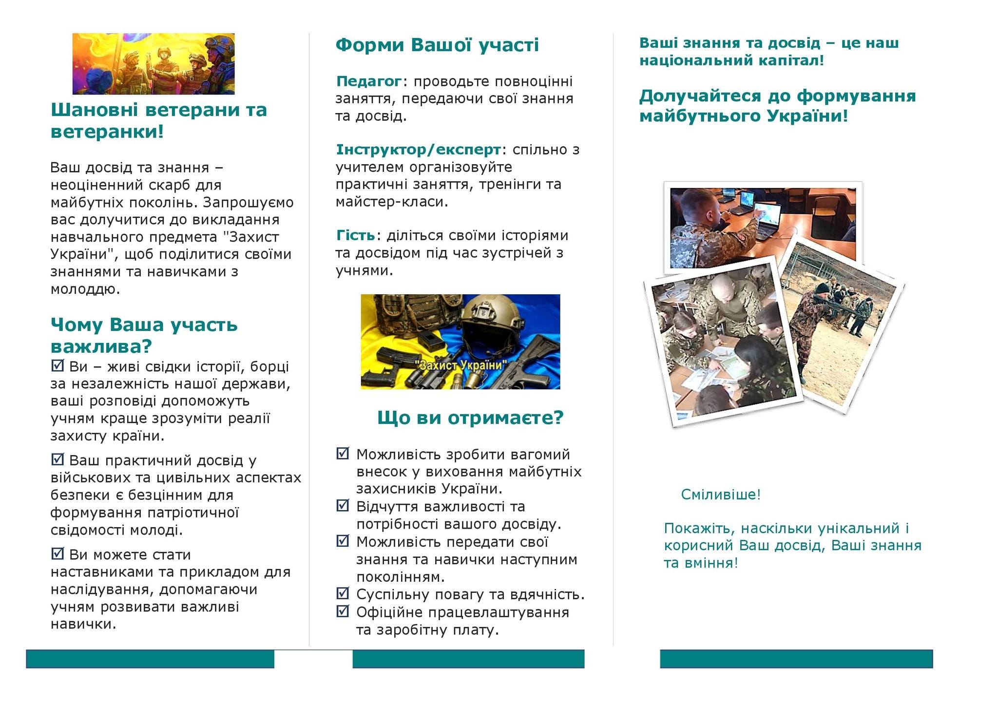 Запрошуємо ветеранів та ветеранок України долучитися до важливої місії – викладання навчального предмета/інтегрованого курсу «Захист України» в освітніх закладах. Ваш безцінний досвід є основою для формування оборонної свідомості підлітків та майбутніх захисників нашої держави.