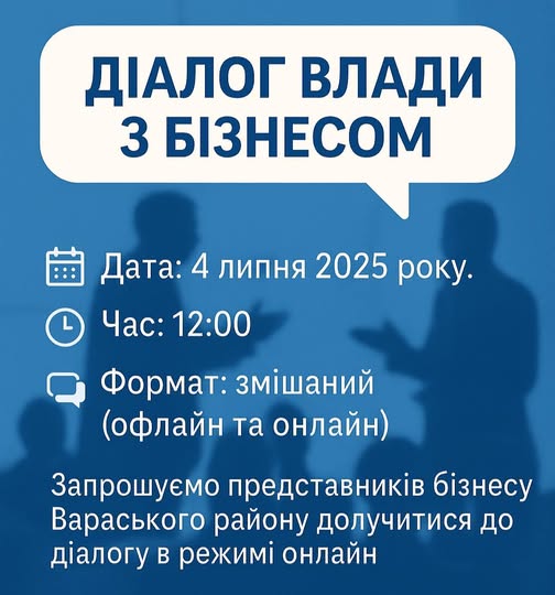 Ми особливо запрошуємо представників бізнесу Вараського району активно долучатися до обговорення в режимі онлайн. Ваша участь є надзвичайно важливою для формування ефективної політики державної підтримки та врахування специфіки регіональних потреб. «Діалог влади та бізнесу» – це не просто зустріч, а дієвий інструмент для спільного розвитку та вирішення проблем.