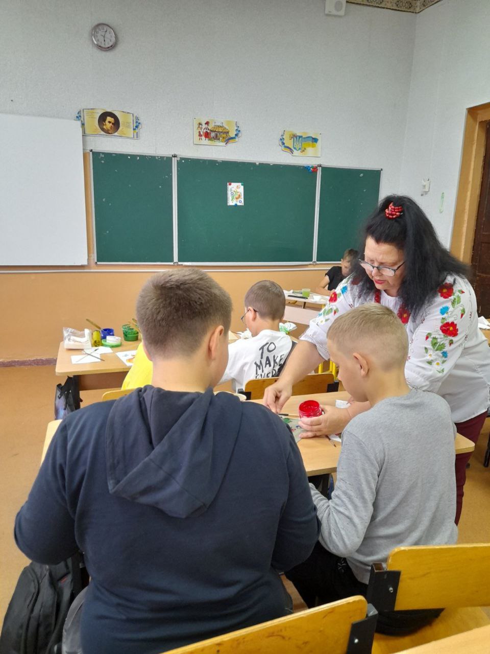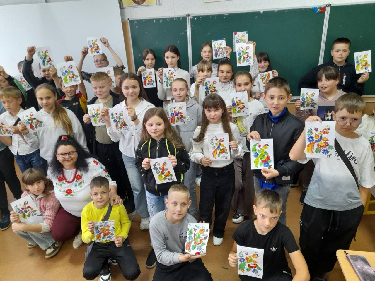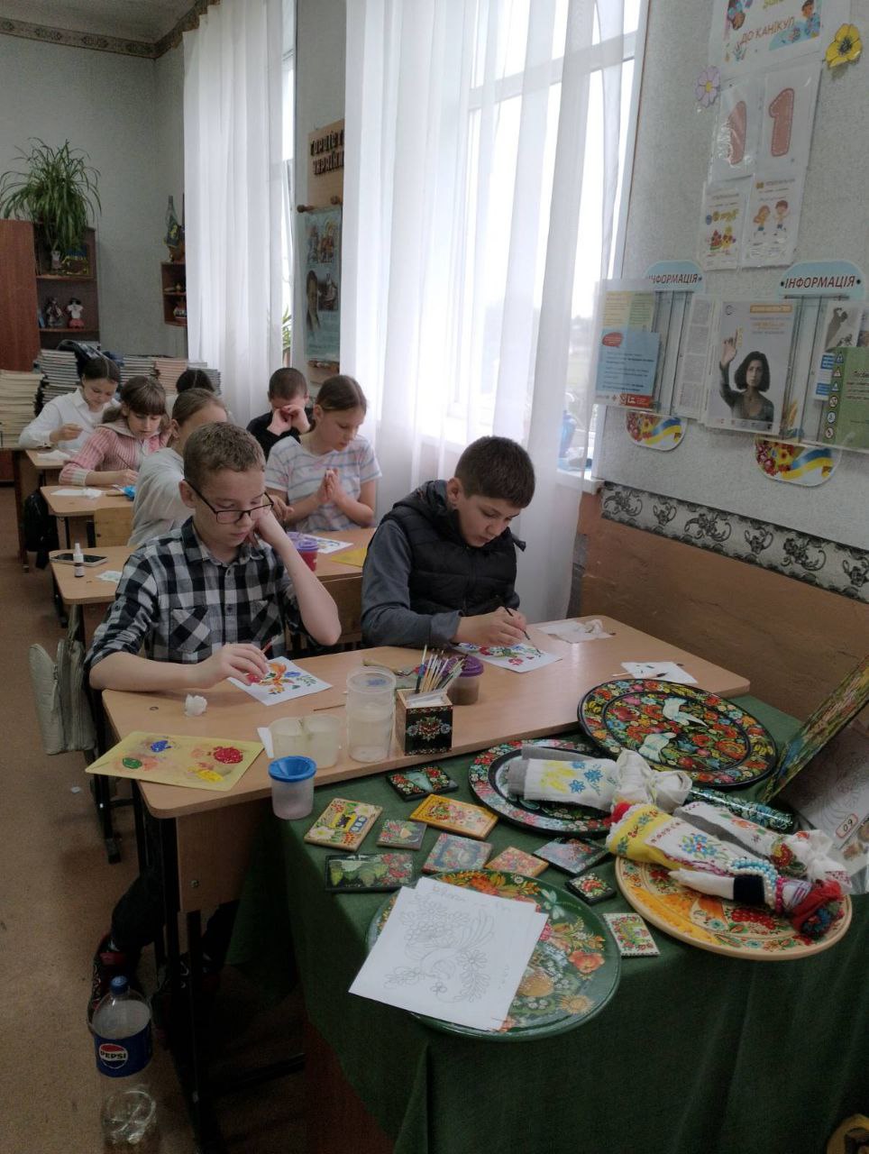 За запрошенням Синельниківського ліцею № 3, керівник міського клубу “Гроно калинове” Ганна Кіпрова, майстриня петриківського розпису, для здобувачів освіти п’ятих класів провела майстер-клас.