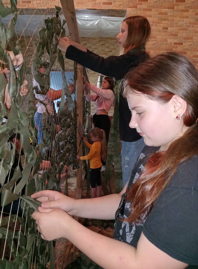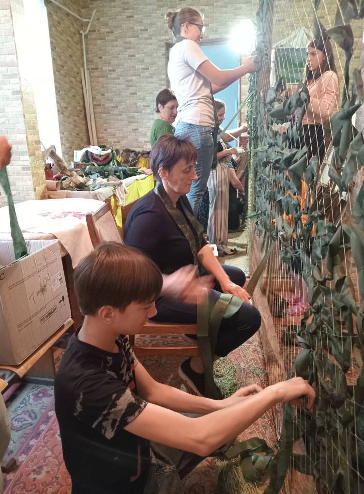 З ентузіазмом взявшись за роботу, волонтери шукали рибальські сітки, перебирали запаси тканини захисних кольорів, освоювали техніку плетіння. Сьогодні ця справа кипить у руках майстринь. До плетіння маскувальних сіток долучаються працівники клубів, матері та дружини захисників, учасники художньої самодіяльності, активні мешканці громади та учнівська молодь. Для молоді це не лише корисне дозвілля, а й патріотичне виховання. Кошти, зібрані під час благодійних концертів, спрямовуються на закупівлю необхідних матеріалів, таких як флізелін та основа, що робить сітки легкими та довговічними.