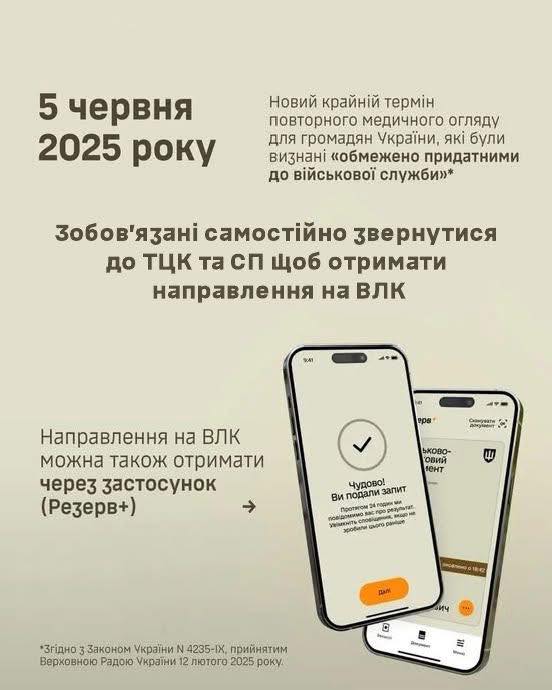 📌Згідно з інформацією від Полтавського обласного центру комплектування та соціальної підтримки, чоловіки віком від 25 до 60 років, визнані “обмежено придатними” до військової служби, повинні до 5 червня виконати наступні вимоги: