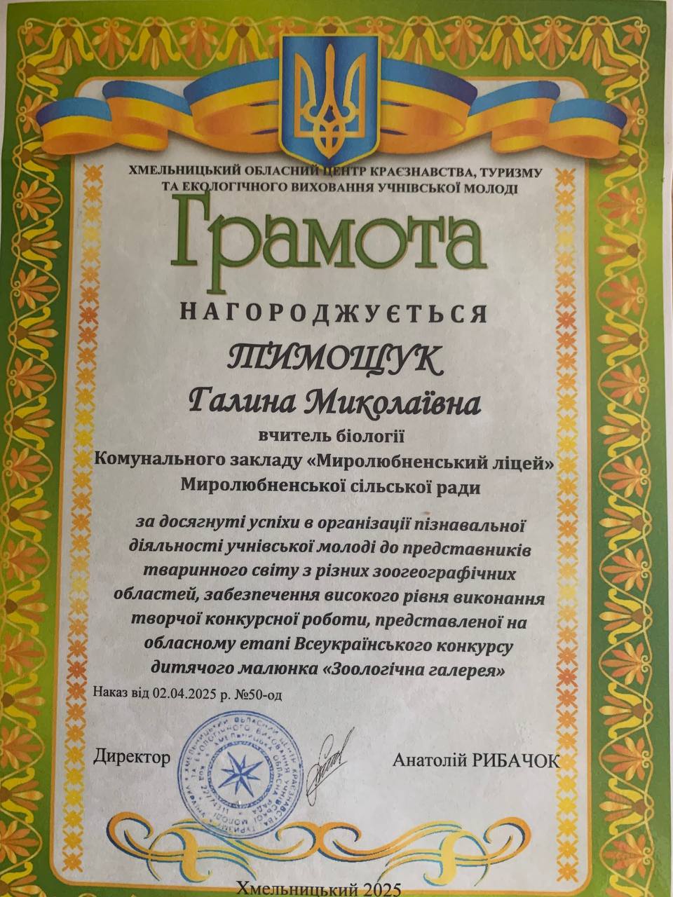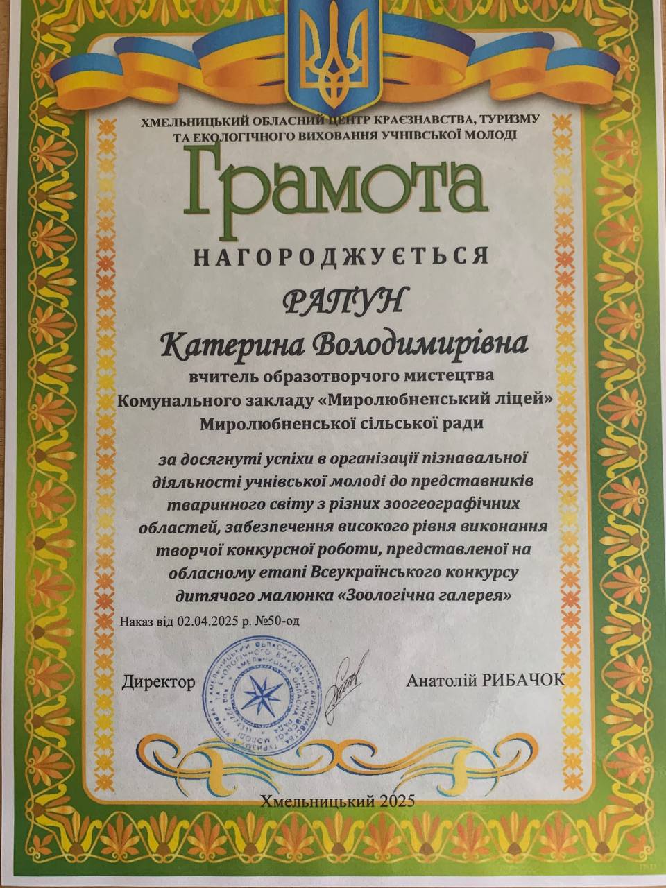 Раді повідомити про результати Всеукраїнського конкурсу дитячого малюнка “Зоологічна галерея”, який відбувся відповідно до наказу №50 від 02.05.2025 року. Конкурс зібрав талановитих юних художників з усієї України, які представили свої чудові роботи, присвячені світу тварин. Журі конкурсу відзначило високий рівень підготовки учасників, їхню креативність та вміння передати красу та різноманіття зоологічного світу.