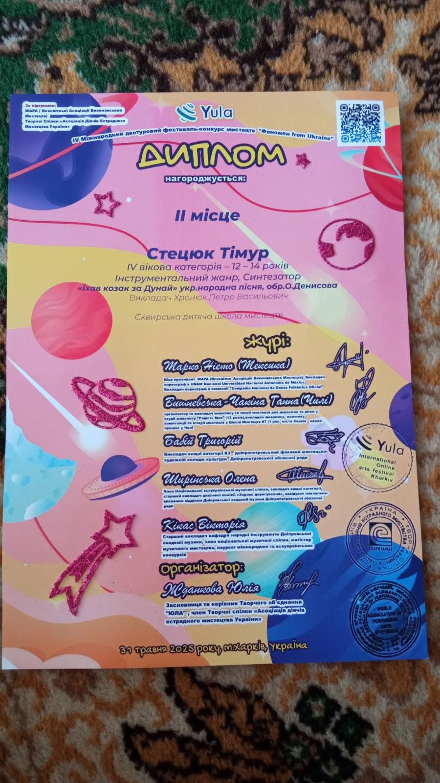 Сквирську дитячу школу мистецтв гідно представили Стецюк Тімур та Багінська Анастасія у номінації “Інструментальний жанр (синтезатор)”, викладач — Хронюк Петро Васильович.