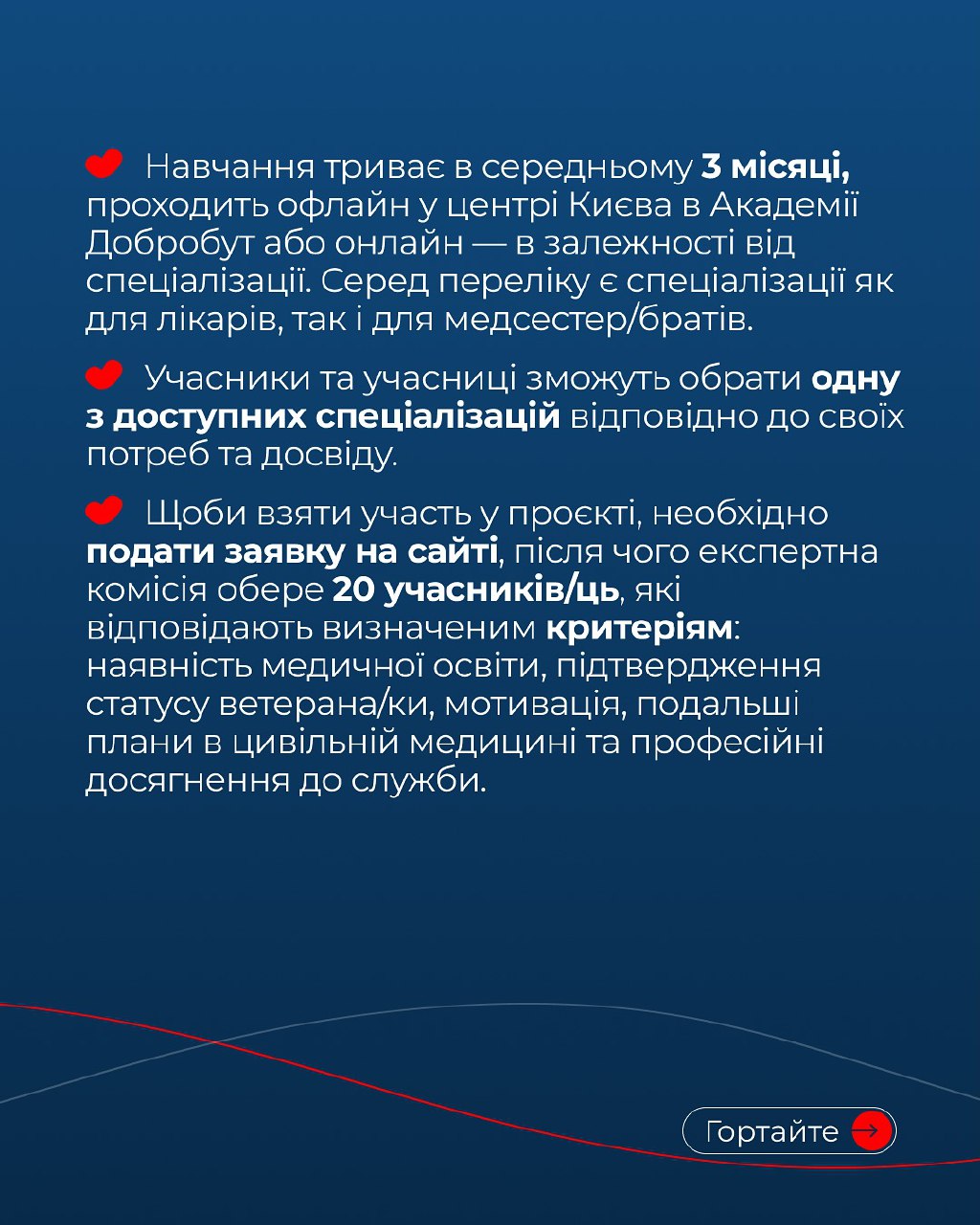 У рамках цієї програми 20 ветеранів та ветеранок з медичною освітою отримають шанс пройти безкоштовне навчання в “Академії Добробут”. Учасники зможуть обрати медичну спеціалізацію, яка найбільше відповідає їхньому попередньому досвіду та актуальним потребам. Навчання доступне як для лікарів, так і для середнього медичного персоналу, охоплюючи різноманітні напрямки.