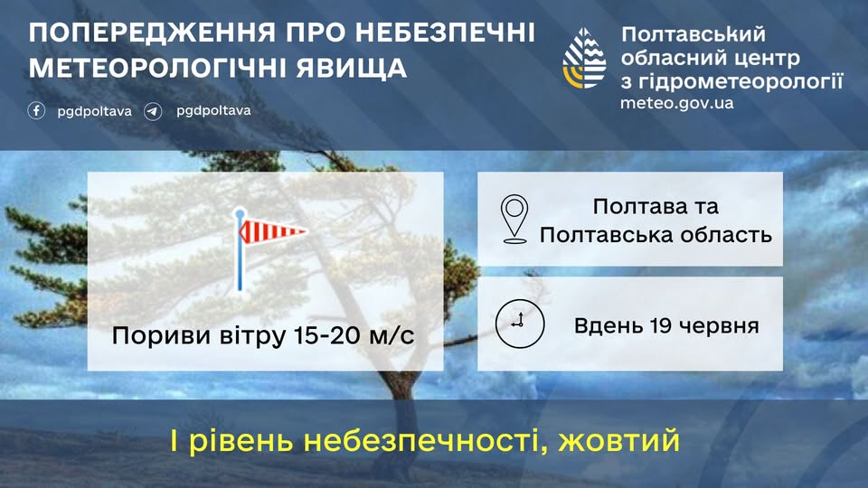За інформацією Полтавського обласного центру з гідрометеорології, сьогодні, 19 червня, на території Полтавської області очікуються значні зміни в погодних умовах. Прогнозуються інтенсивні пориви вітру, які можуть досягати швидкості 15-18 м/с. Це відповідає першому, так званому жовтому рівню небезпеки, що свідчить про потенційну загрозу для населення та інфраструктури регіону.