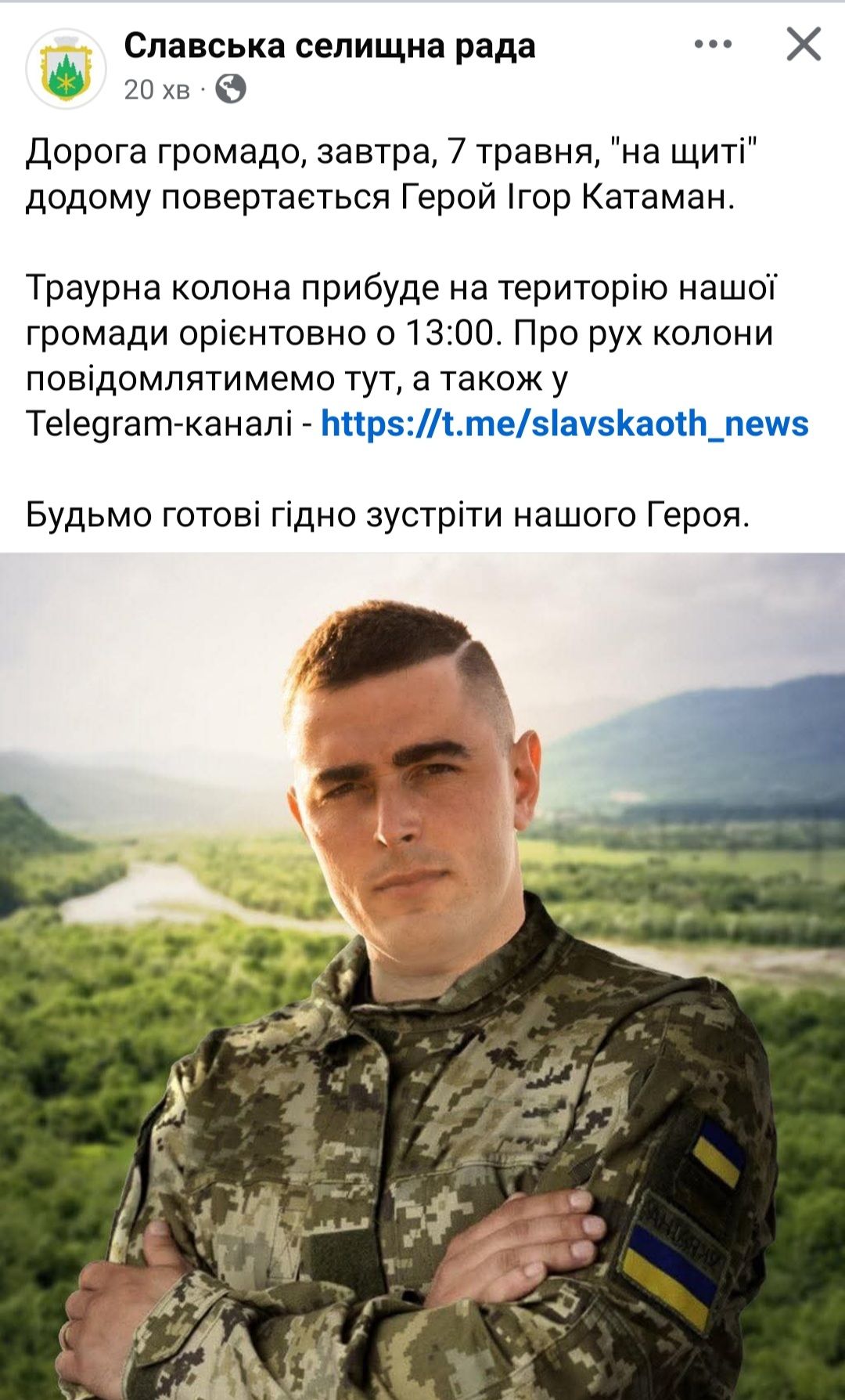 За інформацією Славської селищної ради, завтра, 7 травня, орієнтовно з 12:30 до 13:00 години через Сколівську громаду буде проїжджати траурна колона з Героєм з селища Славсько, Ігорем Катаманом. Просимо мешканців гідно зустріти новітнього Героя вздовж центральних вулиць населених пунктів нашої громади. Слідкуйте за уточненнями щодо маршруту траурної колони.