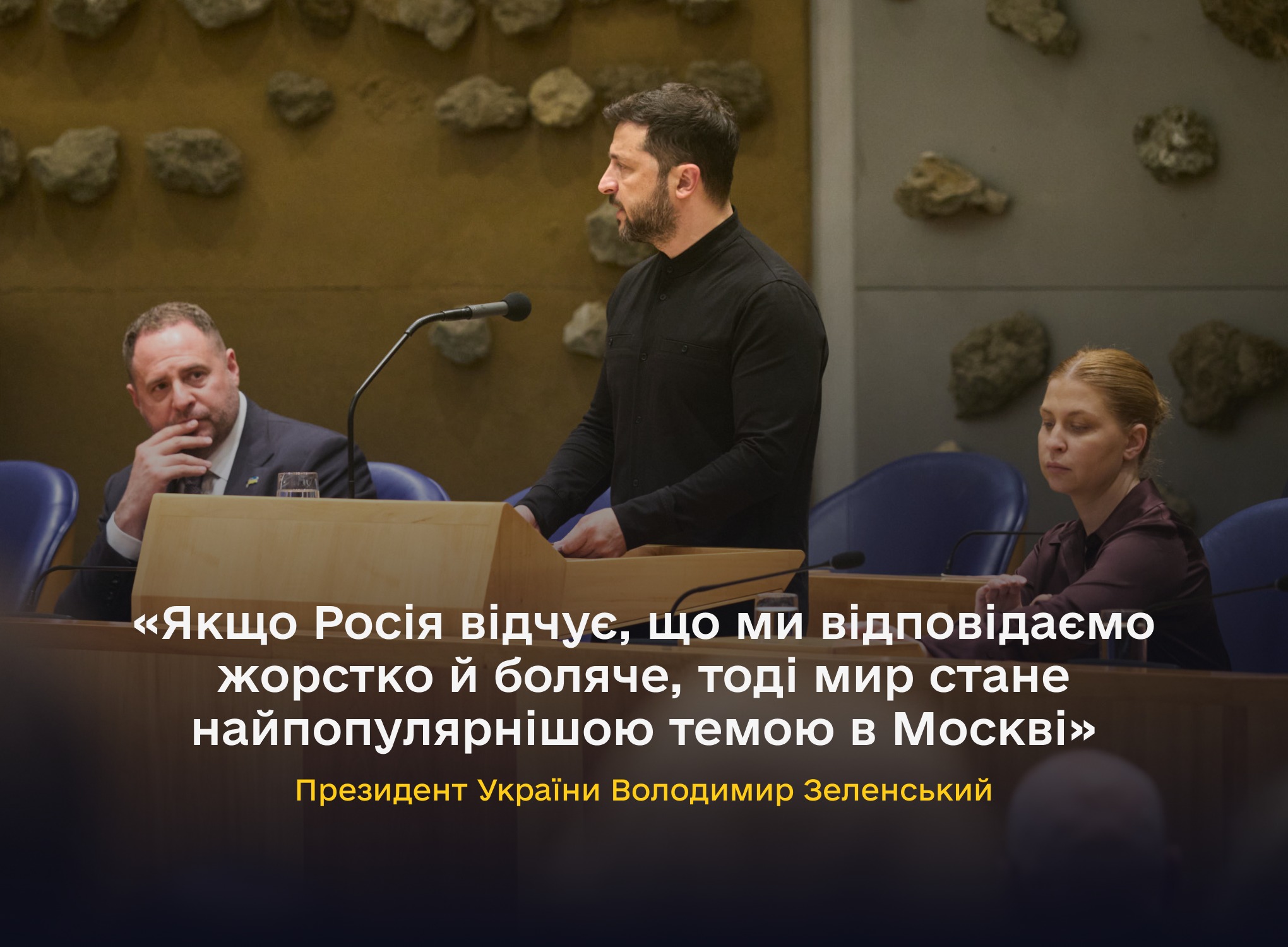 Звертаючись до Сенату й Палати представників парламенту Нідерландів, Президент Володимир Зеленський закликав посилити санкційний тиск на Росію та підтримати оборонні спроможності України.