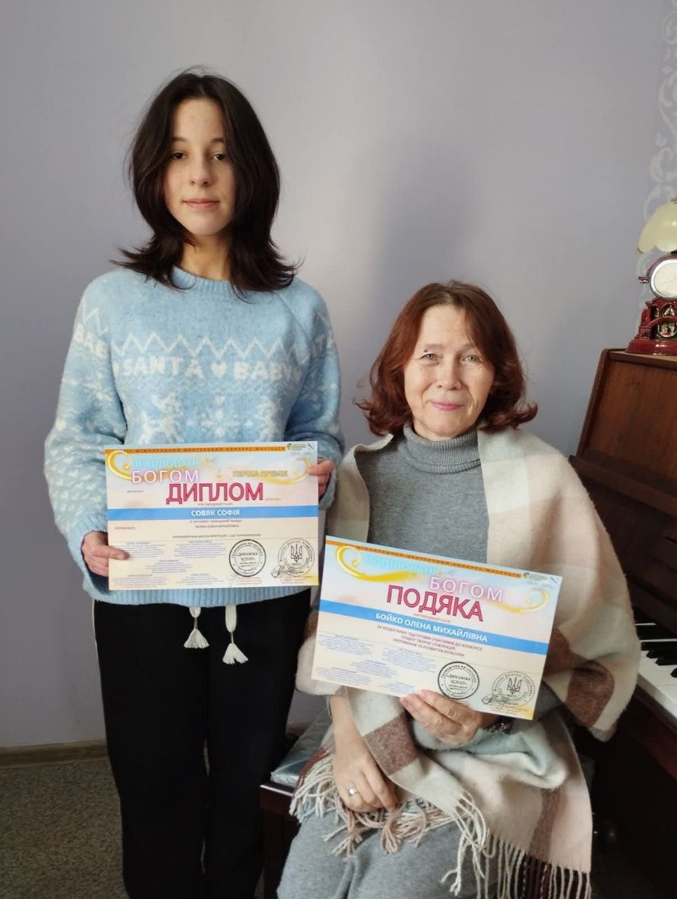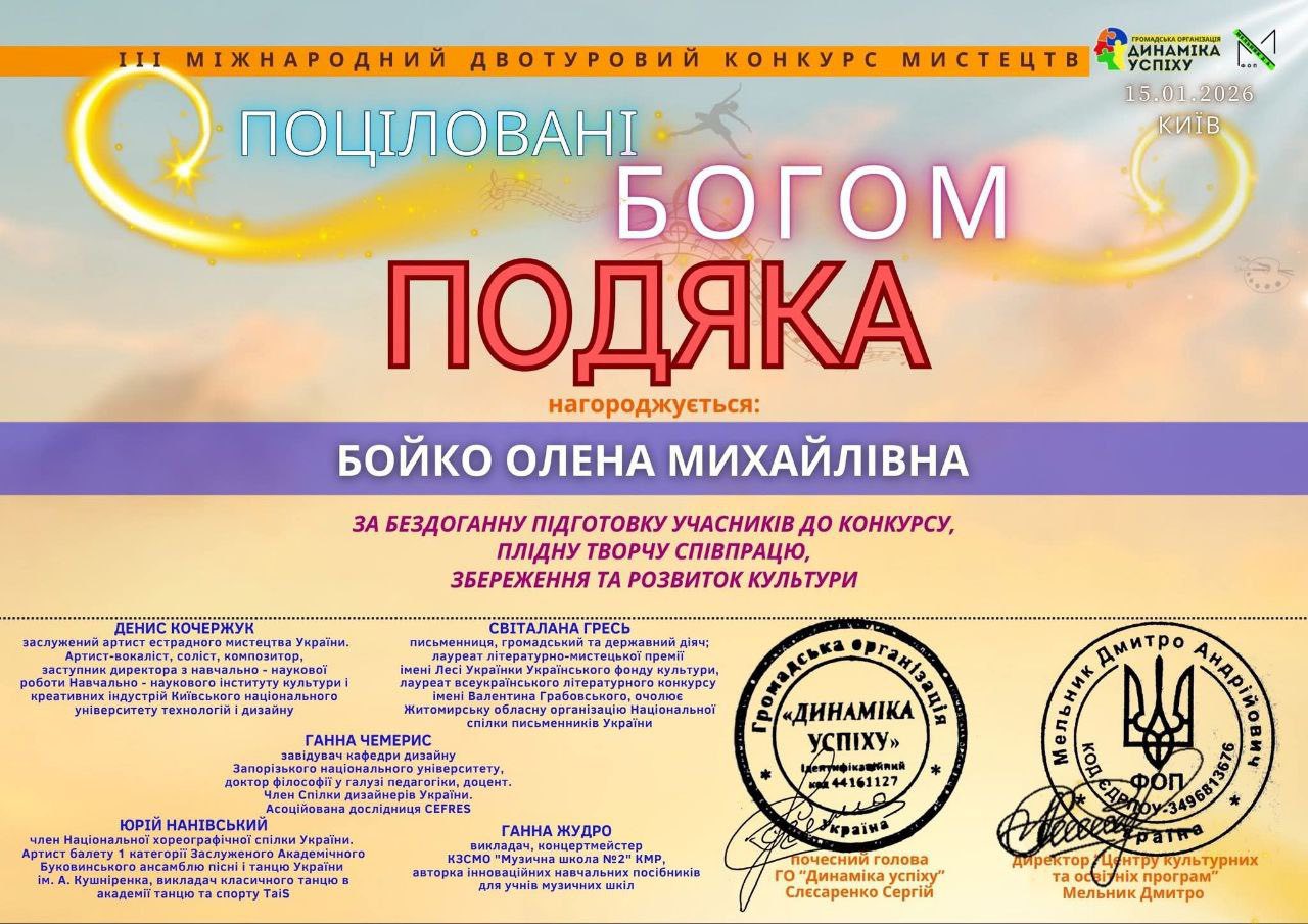 Особливу подяку за підготовку та підтримку талановитої піаністки висловлюємо її наставниці – викладачці Олені Михайлівні Бойко. Її професіоналізм, педагогічний талант та вміння надихати учнів, поступово розкриваючи їхній потенціал, є неоціненними. Це завдяки спільним зусиллям Софії та Олени Михайлівни стало можливим досягнення такого вражаючого результату.