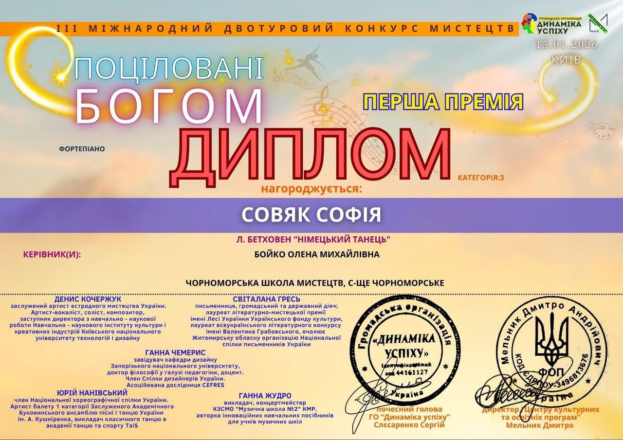 Чорноморська школа мистецтв знову підтверджує свою репутацію кузні талановитих особистостей. Цього разу надзвичайного успіху досягла учениця фортепіанного відділення Софія Совяк. Вона гідно представила Україну на престижному ІІІ Міжнародному двотуровому конкурсі мистецтв «Поціловані Богом» і здобула найвищу нагороду у своїй номінації.