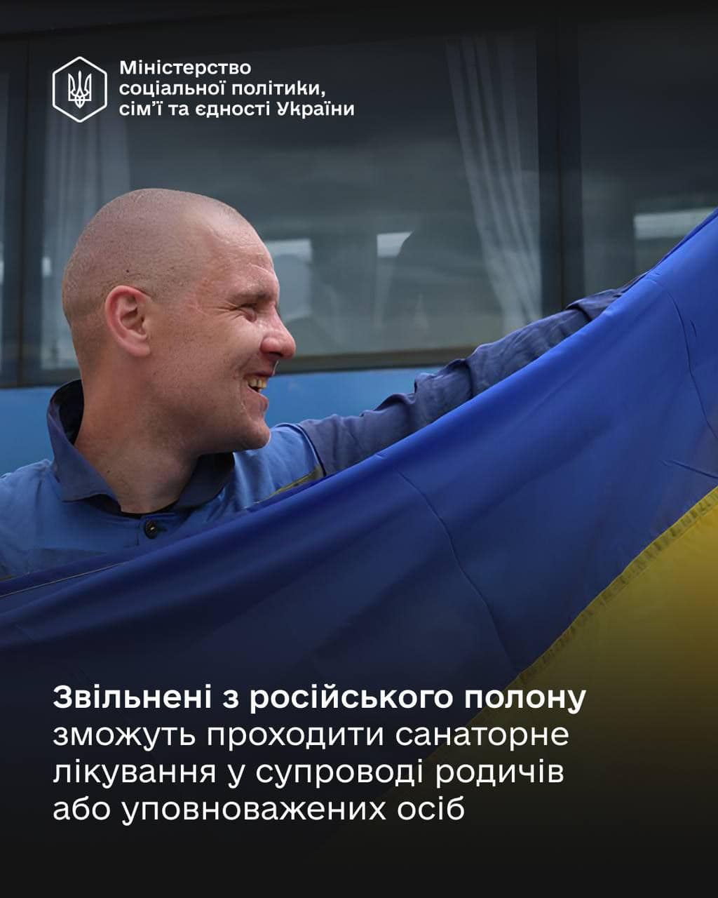 ‼️ Відтепер особи, звільнені з російського полону, матимуть змогу проходити санаторне лікування у супроводі близьких або уповноважених осіб. Ця важлива зміна покликана зробити процес відновлення більш комфортним та ефективним для всіх, хто пройшов через тяжкі випробування. Відповідно до нових правил, за особистим бажанням звільненого, поруч з ним у санаторії може перебувати одна супроводжуюча особа. Важливо зазначити, що ця особа не обов’язково має бути кровним родичем, що розширює коло потенційних помічників у процесі реабілітації.